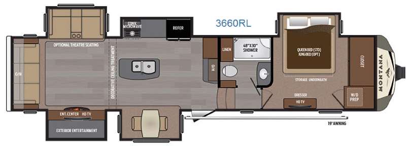 This Keystone Montana fifth wheel 3660RL offers plenty of space with FIVE slides, along with a rear living area, kitchen island, exterior entertainment center, plus much more!