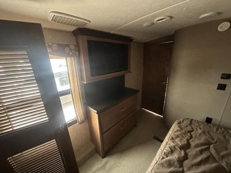 Through the door at the head of the hall leads into a spacious master bedroom in front. Here you can relax and unwind from a full day of adventure. Sleep comfortably on a queen or optional king bed slide out with storage underneath. There is a dresser opposite with overhead HDTV. The front features a closet, washer/dryer prep area, and so much more!