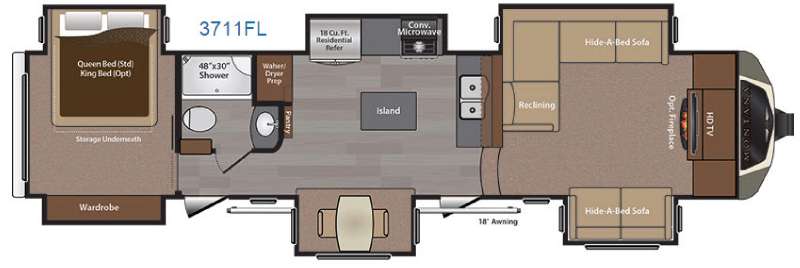 Camping in this Keystone Montana will feel a lot like being home except for the surrounding view. This unit offers an awesome kitchen space with dual opposing slides and a residential refrigerator, plus a rear bedroom. Oh, and did I mention the large front living area and SIX slides!!