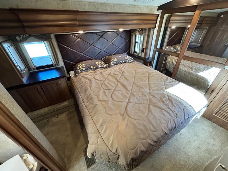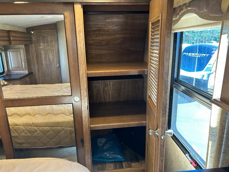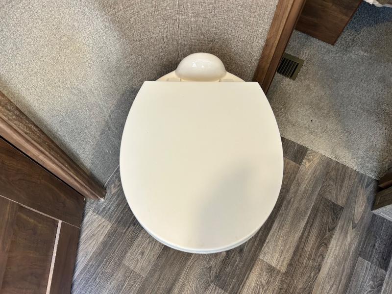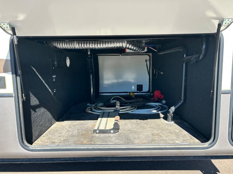 The bath features a 48" x 30" shower, toilet, and vanity with sink. The sliding door in the bath leads to the front master suite. In the hall you will find a slide out space prepped for a washer and dryer that is also connected to the bedroom closet and queen bed slide out. You can choose an optional king bed if you enjoy a bit more sleeping space, and both offer storage underneath.