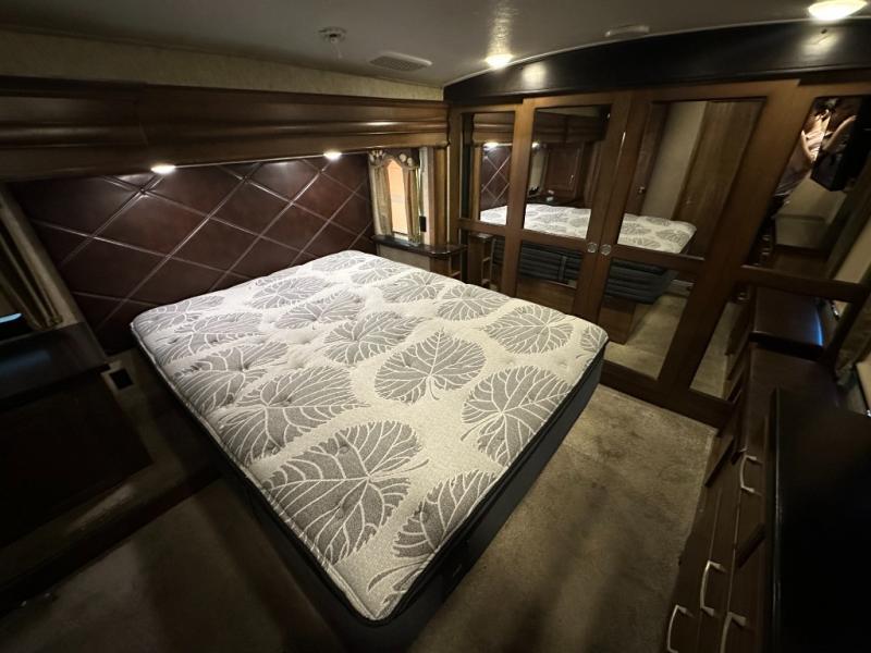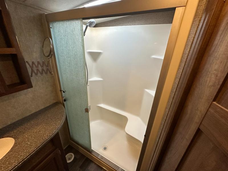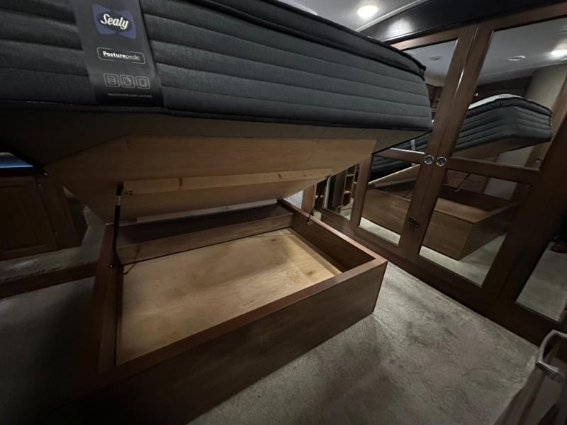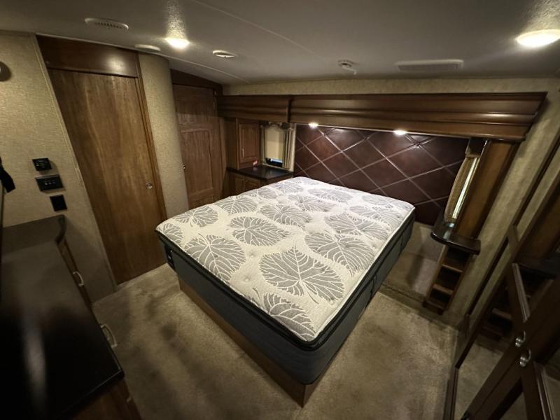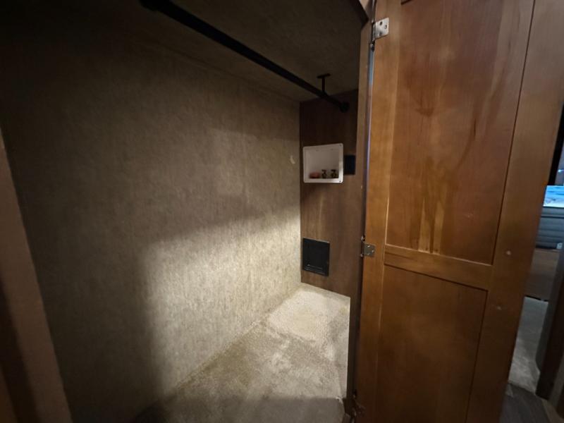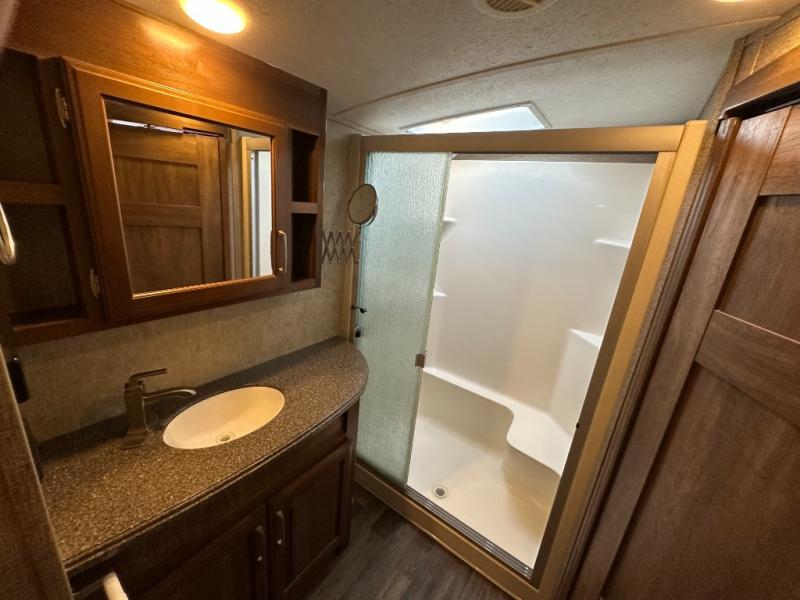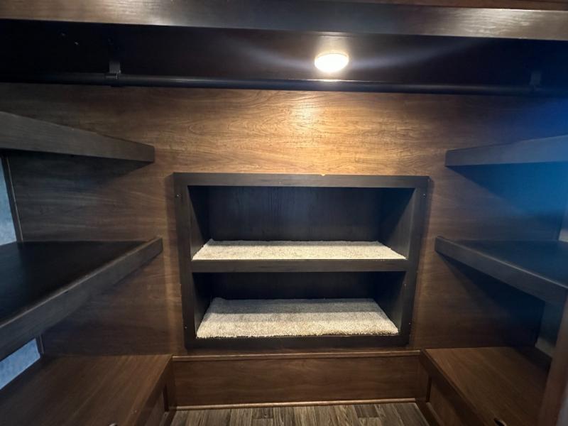 The bath features a 48" x 30" shower, toilet, and vanity with sink. The sliding door in the bath leads to the front master suite. In the hall you will find a slide out space prepped for a washer and dryer that is also connected to the bedroom closet and queen bed slide out. You can choose an optional king bed if you enjoy a bit more sleeping space, and both offer storage underneath.