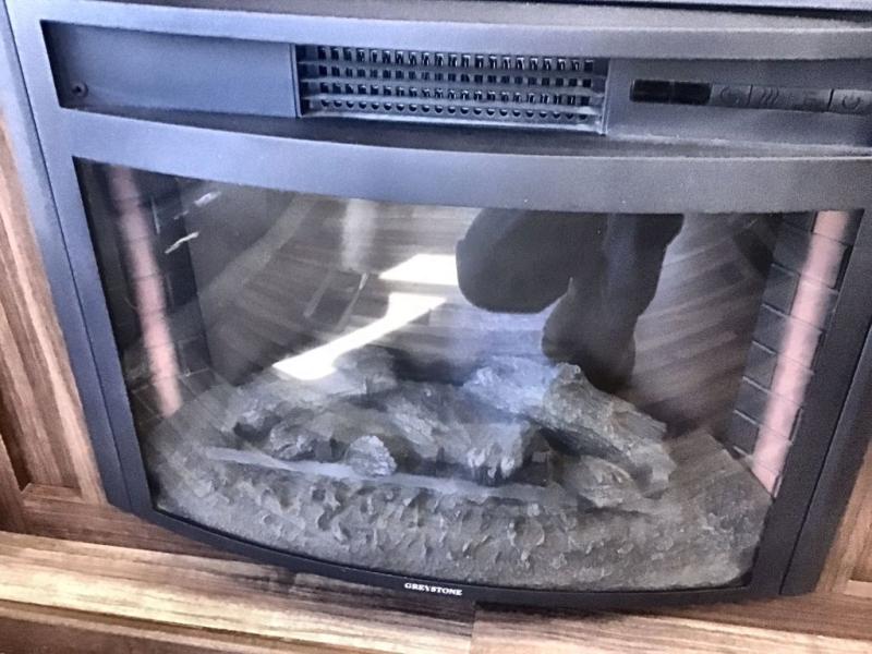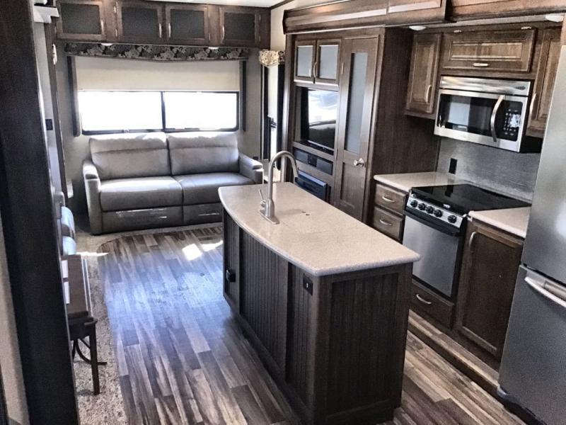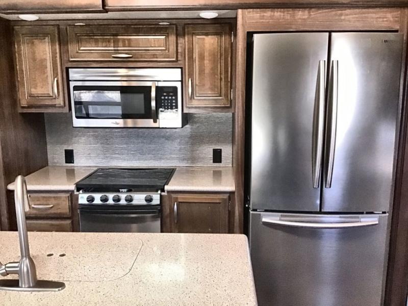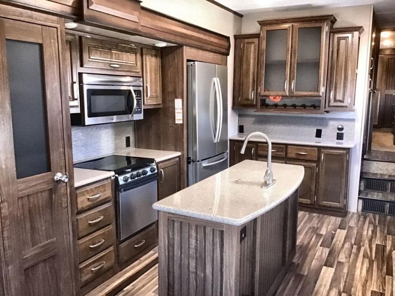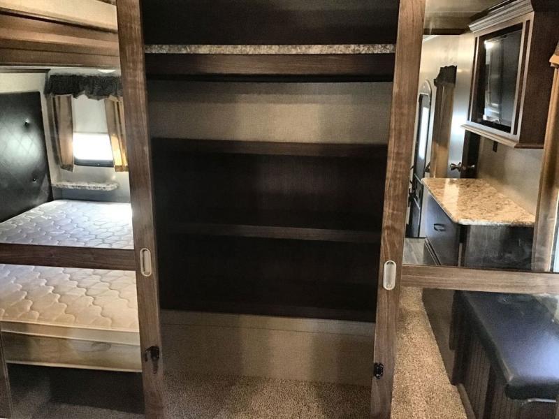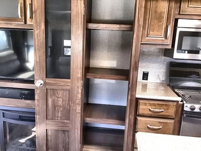 As you enter notice how open the main living space is with dual opposing slides fully extended. There is a dinette with four chairs and optional theater seating to the left of the door. Along the rear wall find a hide-a-bed sofa with overhead cabinets that stretch the entire width of the trailer. Adjacent to the hide-a-bed is an entertainment center slide with HDTV and fireplace below. This slide also features a pantry for food storage needs, counter space, a three burner range with overhead microwave oven, and residential refrigerator. A convenient kitchen island offers additional storage and counter space, plus it is where you will find the double sink for cleaning up. A nice hutch is located along the interior wall straight in from the entry door for storage.