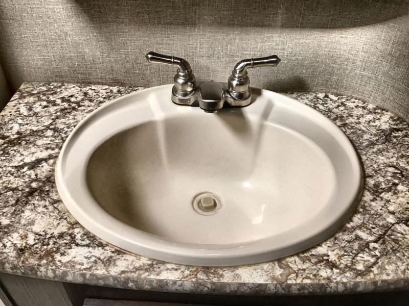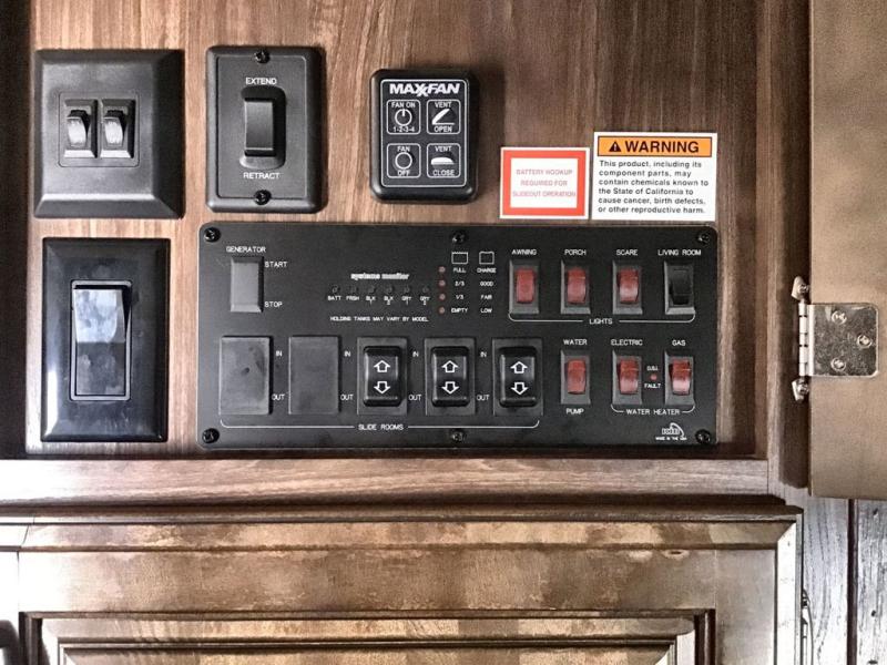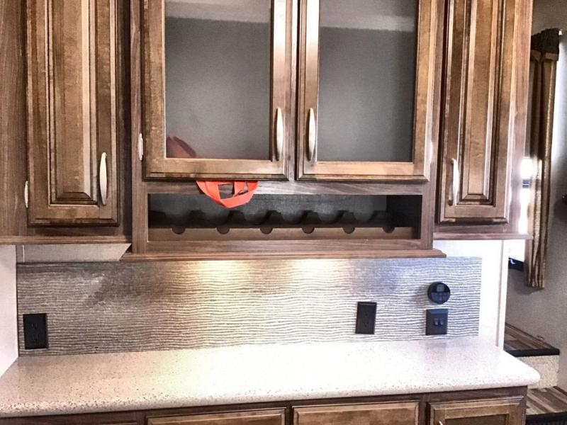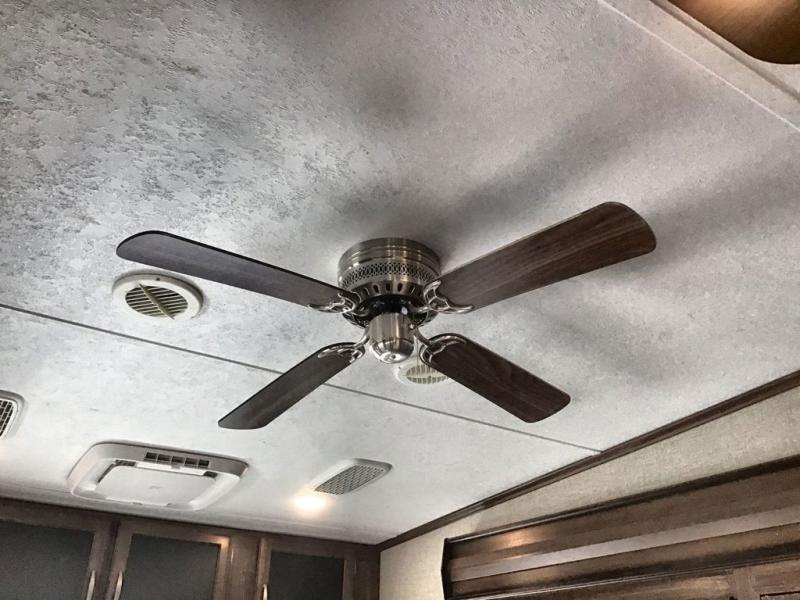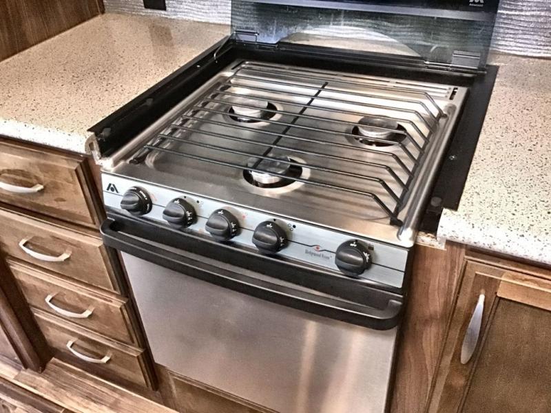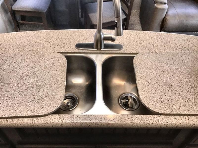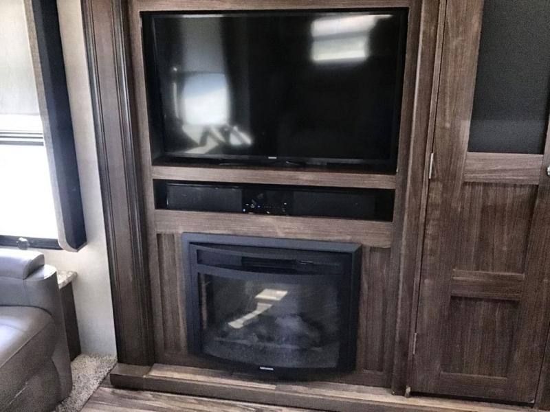 As you enter notice how open the main living space is with dual opposing slides fully extended. There is a dinette with four chairs and optional theater seating to the left of the door. Along the rear wall find a hide-a-bed sofa with overhead cabinets that stretch the entire width of the trailer. Adjacent to the hide-a-bed is an entertainment center slide with HDTV and fireplace below. This slide also features a pantry for food storage needs, counter space, a three burner range with overhead microwave oven, and residential refrigerator. A convenient kitchen island offers additional storage and counter space, plus it is where you will find the double sink for cleaning up. A nice hutch is located along the interior wall straight in from the entry door for storage.