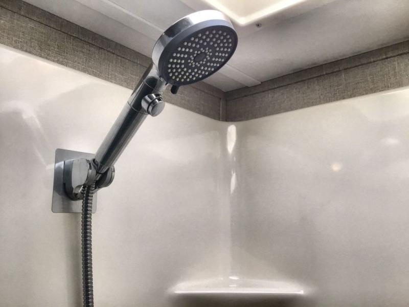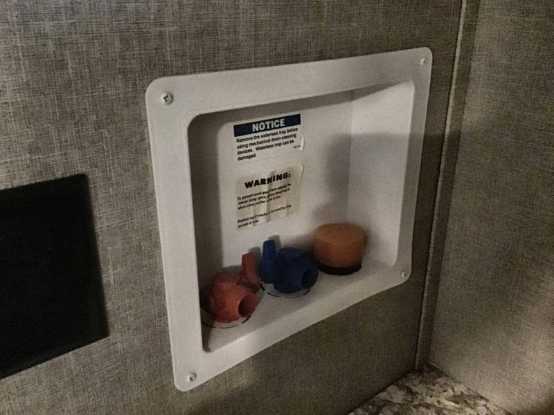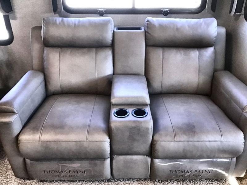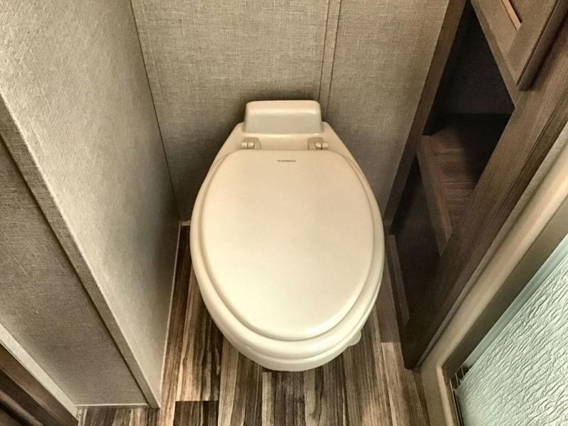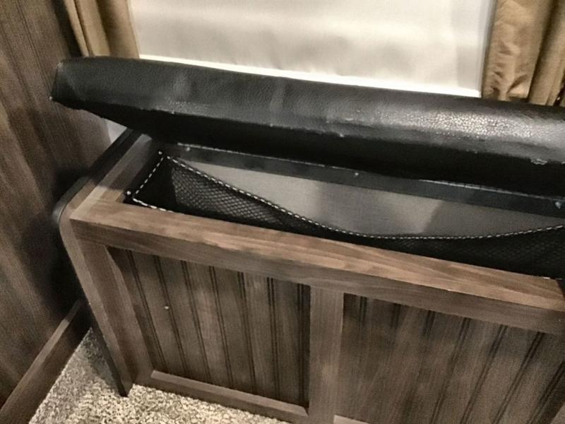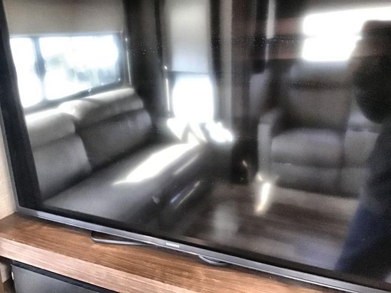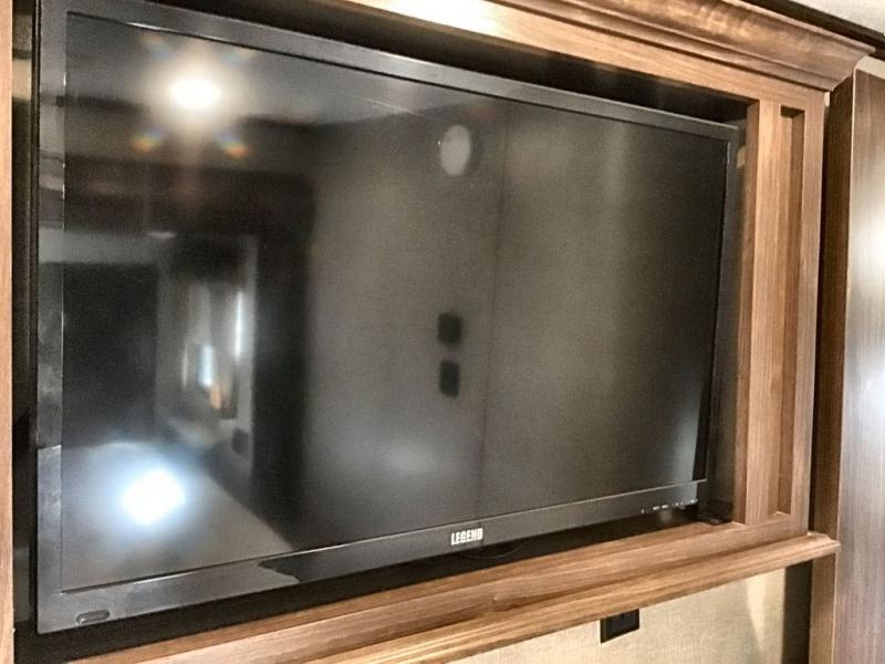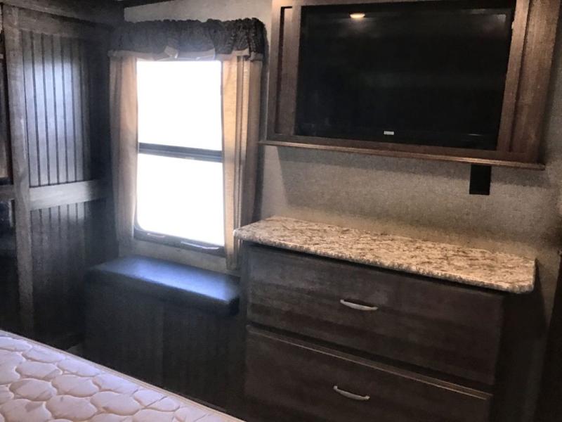 The front master bedroom is behind the door at the head of the hall and provides a welcome retreat with queen or optional king bed slide including storage beneath the bed. A dresser is found opposite the bed along the curb side wall along with an HDTV, a bench seat, and the front wall features a wardrobe with washer and dryer prep, plus so much more!