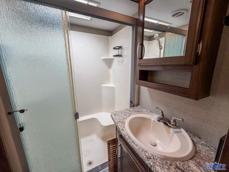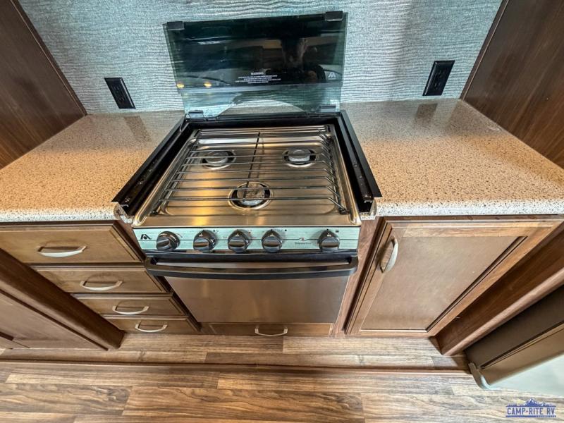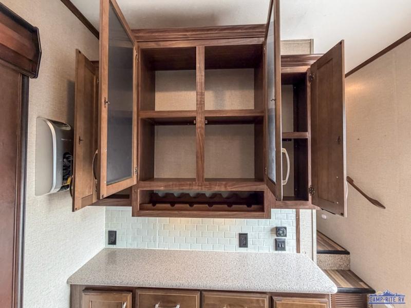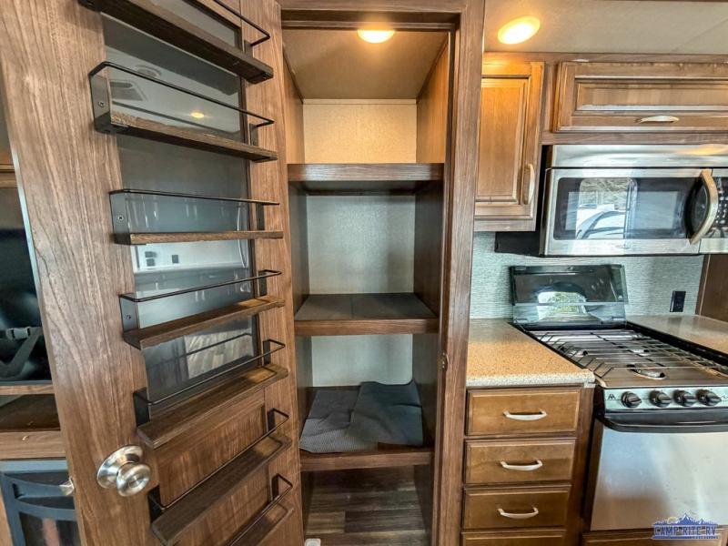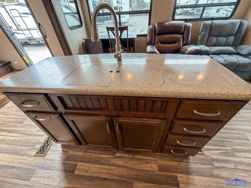 As you enter notice how open the main living space is with dual opposing slides fully extended. There is a dinette with four chairs and optional theater seating to the left of the door. Along the rear wall find a hide-a-bed sofa with overhead cabinets that stretch the entire width of the trailer. Adjacent to the hide-a-bed is an entertainment center slide with HDTV and fireplace below. This slide also features a pantry for food storage needs, counter space, a three burner range with overhead microwave oven, and residential refrigerator. A convenient kitchen island offers additional storage and counter space, plus it is where you will find the double sink for cleaning up. A nice hutch is located along the interior wall straight in from the entry door for storage.