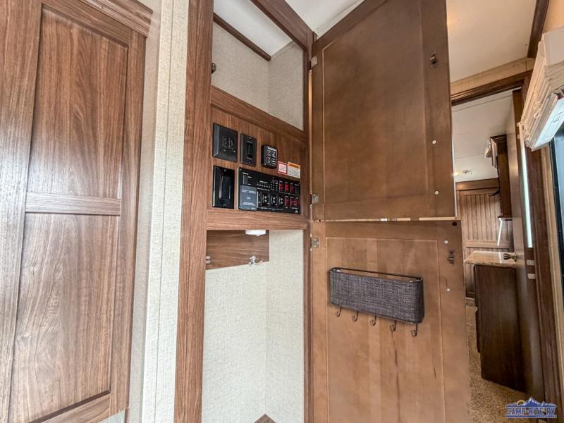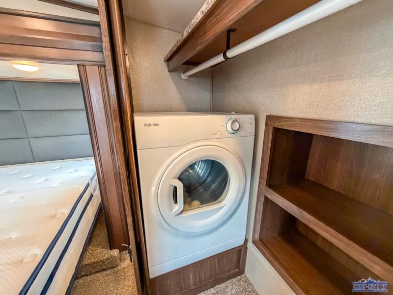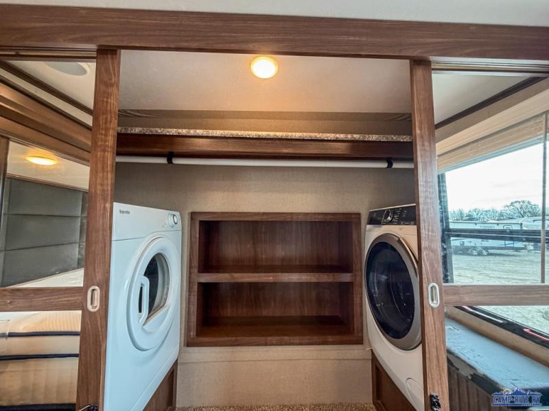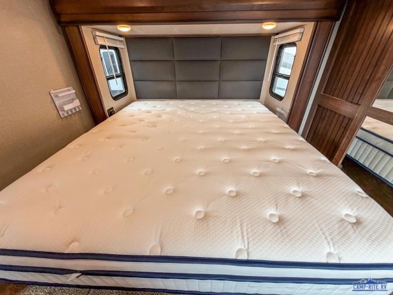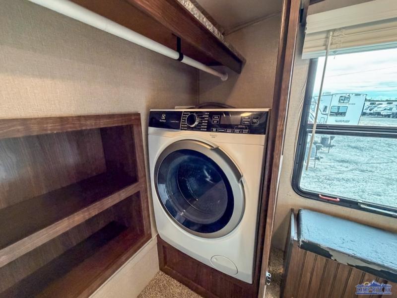 The front master bedroom is behind the door at the head of the hall and provides a welcome retreat with queen or optional king bed slide including storage beneath the bed. A dresser is found opposite the bed along the curb side wall along with an HDTV, a bench seat, and the front wall features a wardrobe with washer and dryer prep, plus so much more!