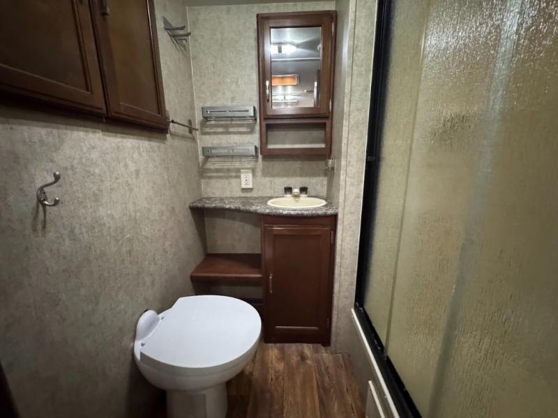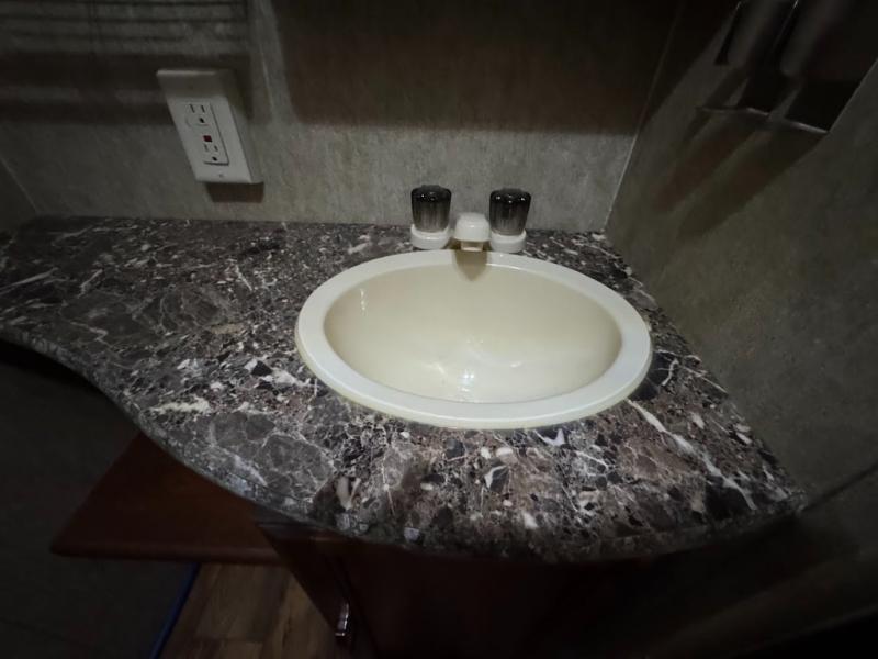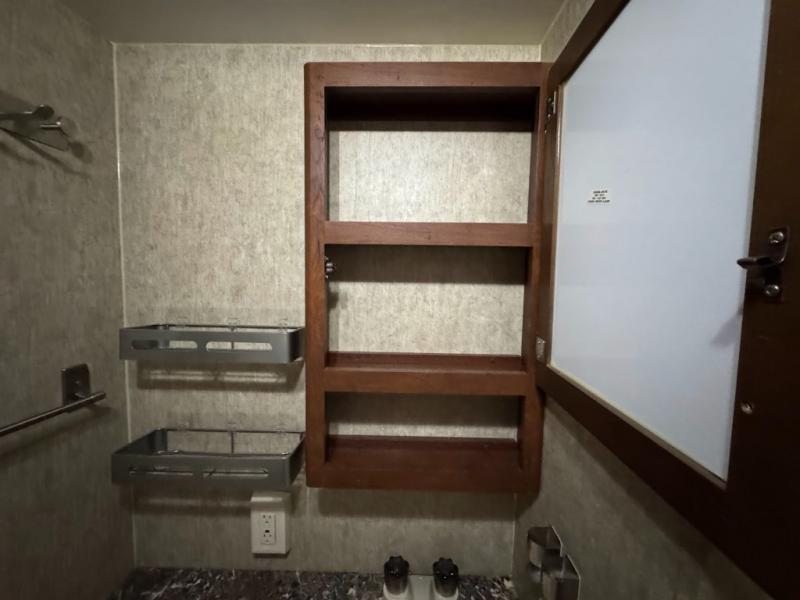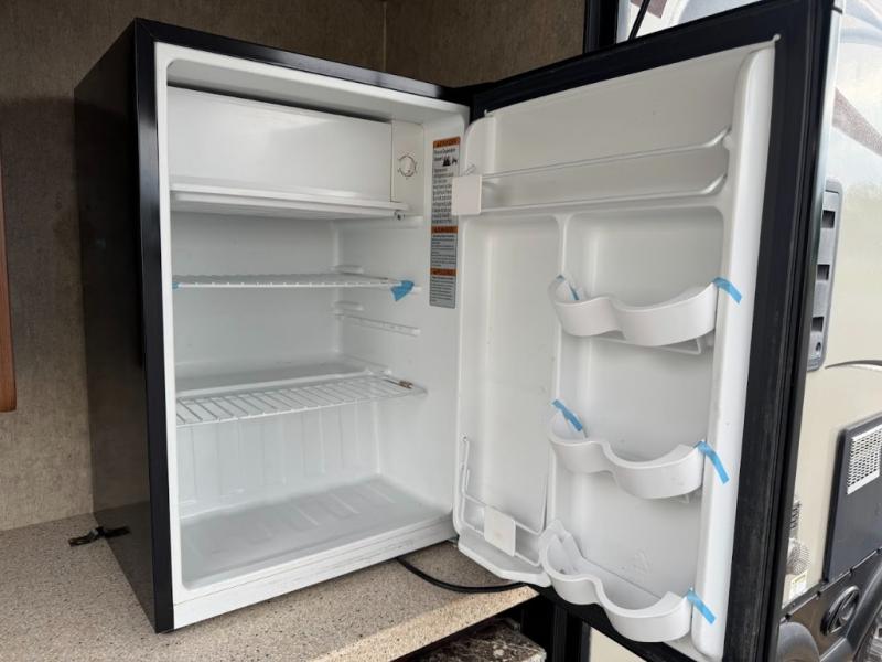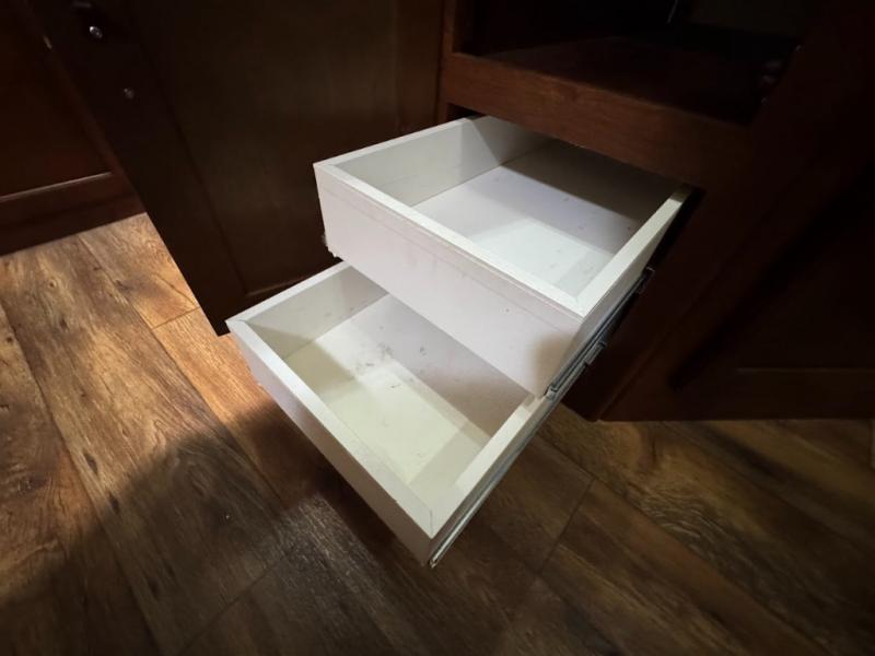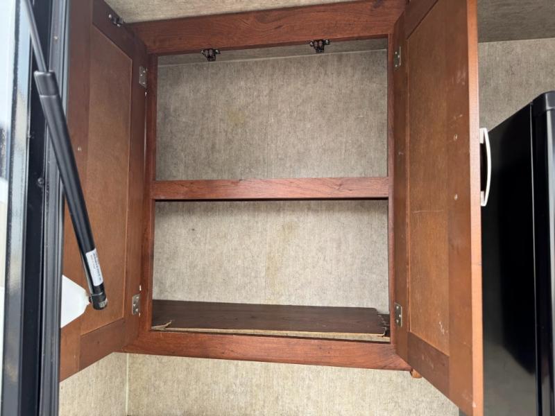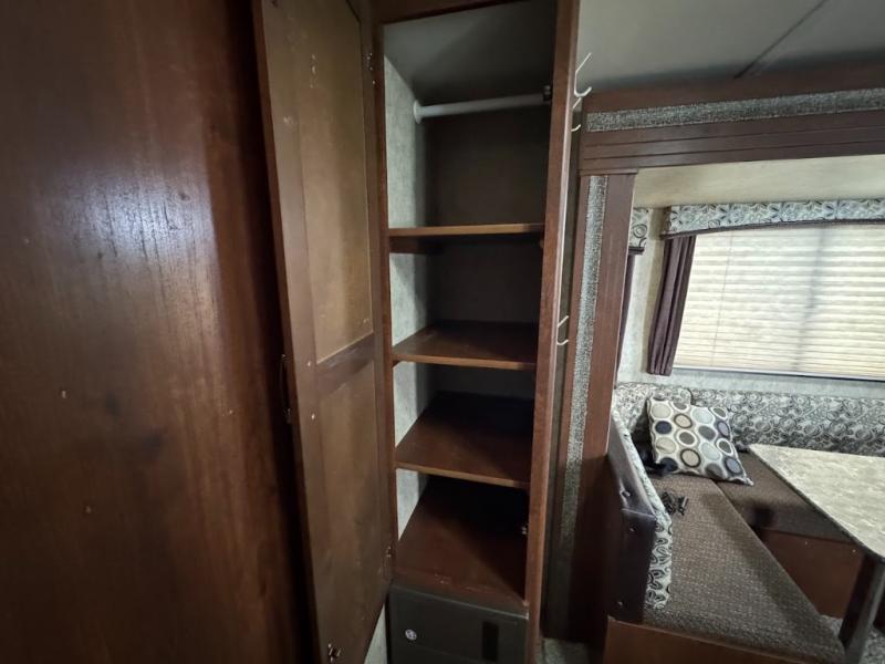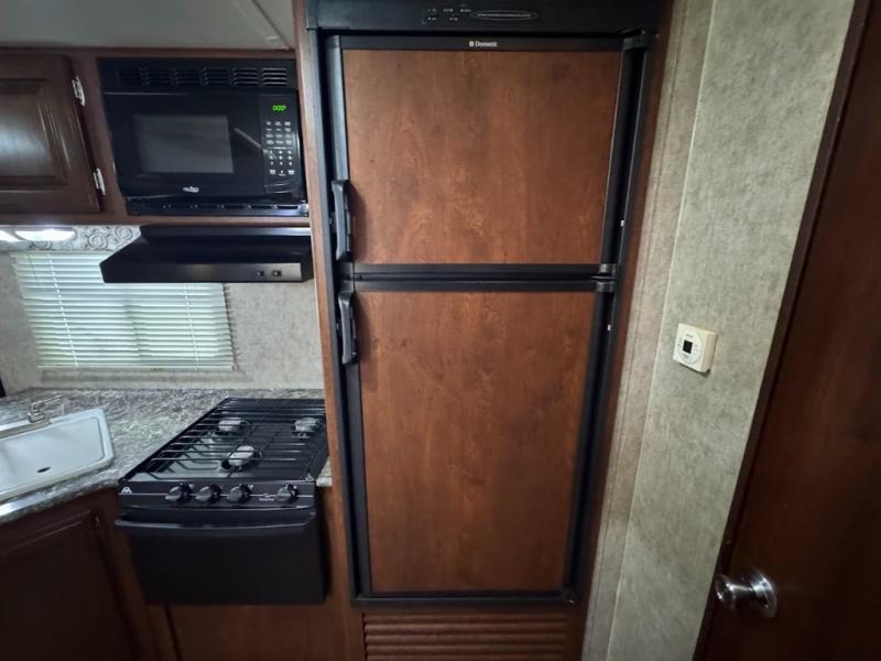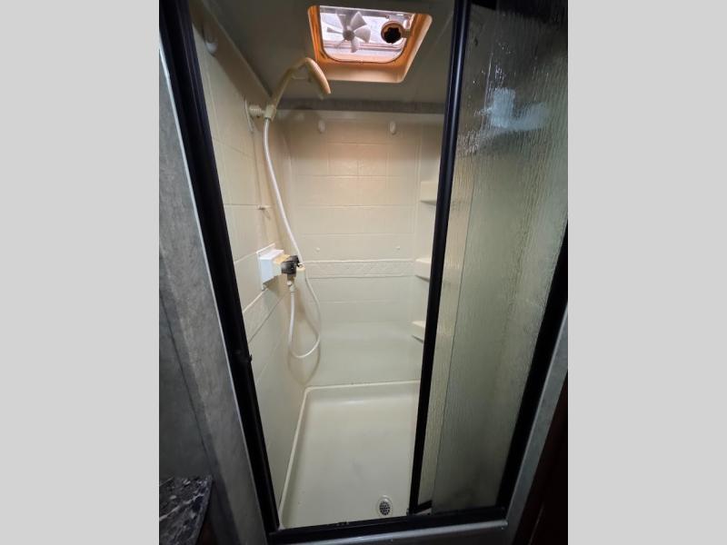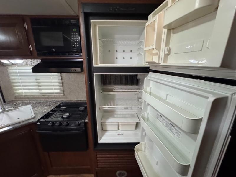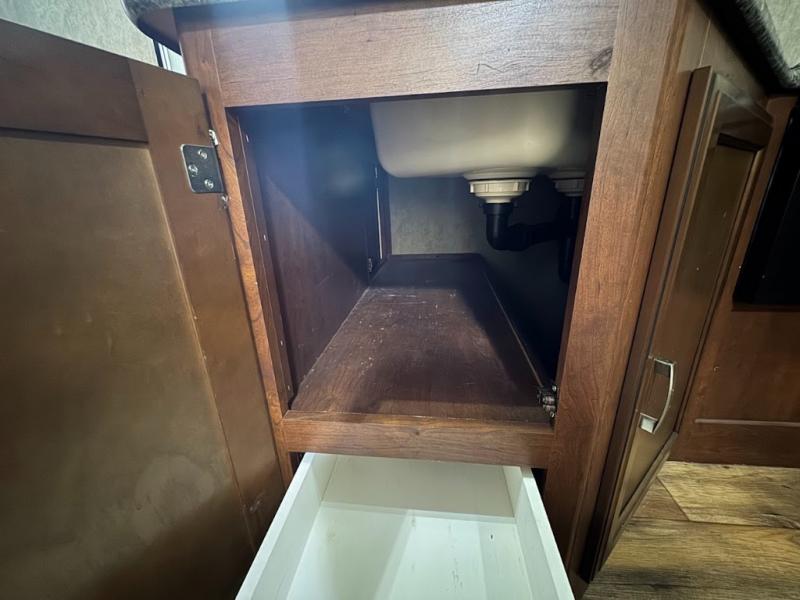 You can easily cook and prepare food with the appliances provided. There is a refrigerator, three burner range, and double kitchen sink on the L-shaped countertop. A pantry can be found just off the dinette slide which is perfect for storing dry goods and more.