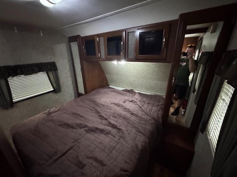 The front bedroom offers a queen size bed with bedside wardrobes, an overhead cabinet, and convenience center for all the controls along the curbside wall.