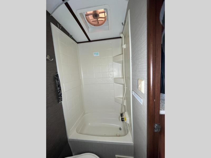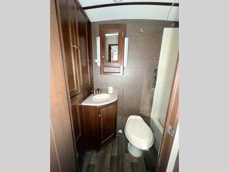 The rear features a bathroom with large wardrobe for storage. There is a tub/shower, toilet, sink, and so much more!
