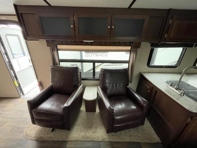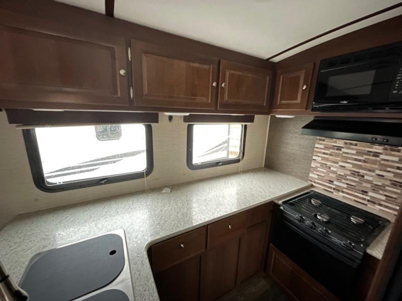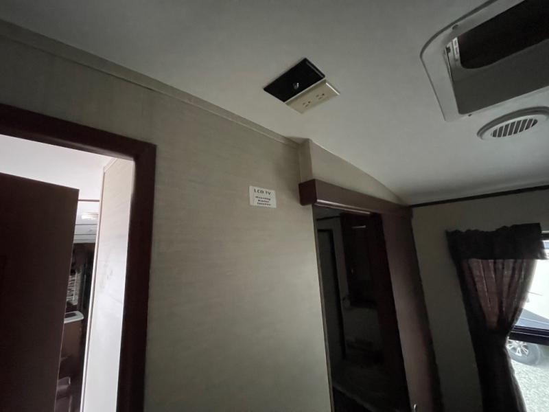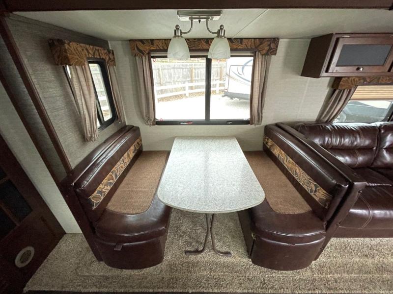 In the main living area enjoy the added space thanks to a large slide out. To the left of the entry door there are two lounge chairs with overhead cabinets that stretch all the way to the rear of the unit and around the corner in the kitchen area. Opposite in the slide out find a tri-fold sofa and booth dinette. The perfect spot for enjoying your meals, or just hanging out. A nearby entertainment center is perfect for viewing from any seating space.