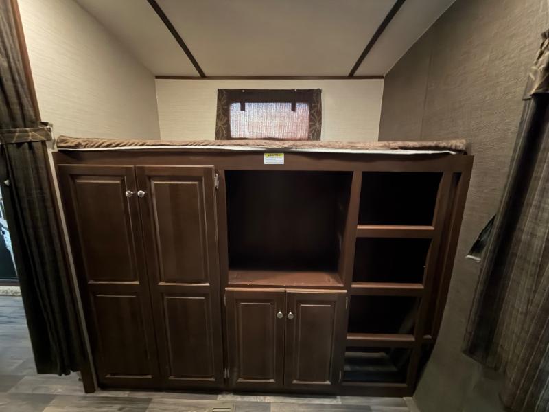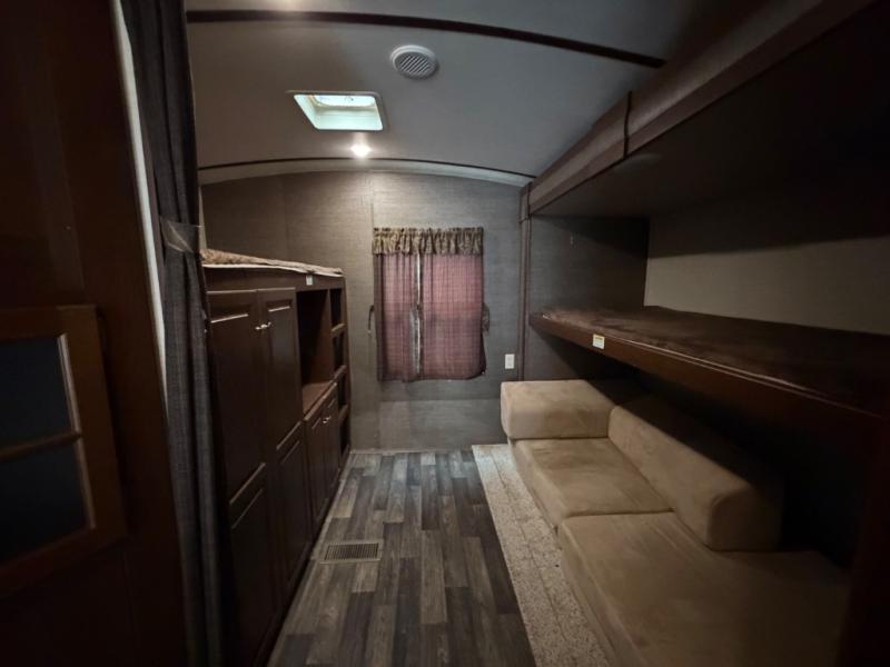 The rear bunkhouse will be a favorite for the kids, or the perfect space for extra guest to have a private retreat of their own. There is a futon slide with 32" x 74" flip bunk above on one side, and a 32" x 74" bunk above a wardrobe opposite with entertainment center and ladder too.