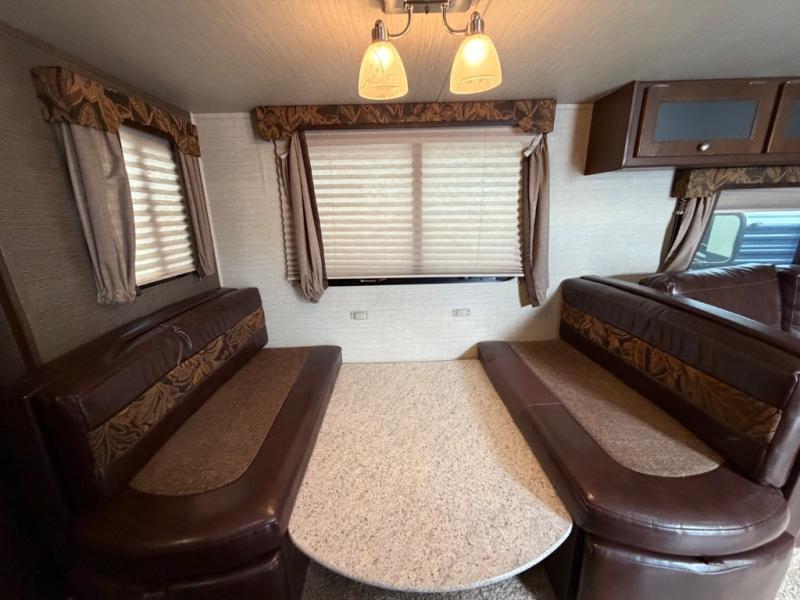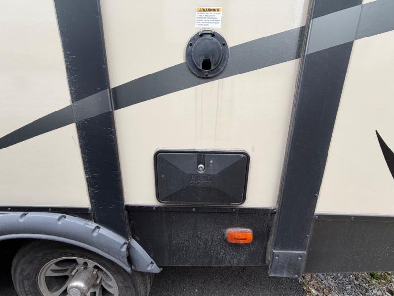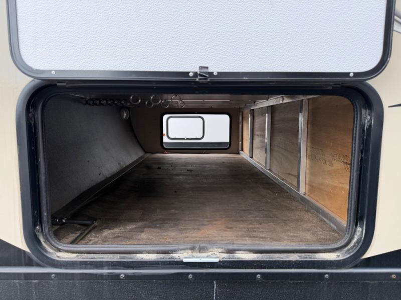 There is a pass-through storage compartment in the front for all of your exterior camping gear. There is also an exterior kitchen that includes a swing out cook top with two burners, a refrigerator, sink, and storage space, plus so much more!