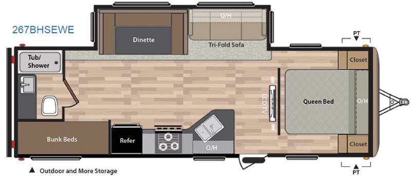 A rear set of bunks, rear bath, and large single slide provide a spacious way to travel in this Keystone Springdale 267BHSEWE travel trailer.