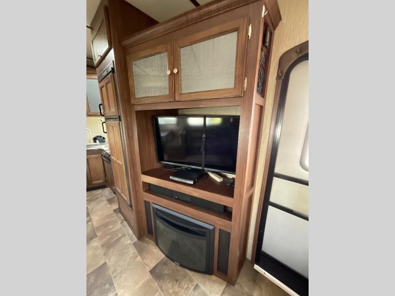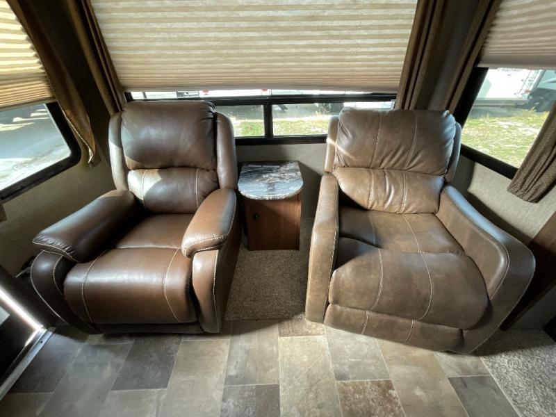 Step inside and be greeted by a wide open living area featuring two swivel rocking chairs along the rear wall that also includes a end table and overhead storage cabinets. You can choose two optional rocker recliners instead. There is a tri-fold sleeper sofa and booth dinette slide opposite the door side. Enjoy the entertainment center featuring a 40" TV and fireplace just to the right of the entry door for your inside camping days.