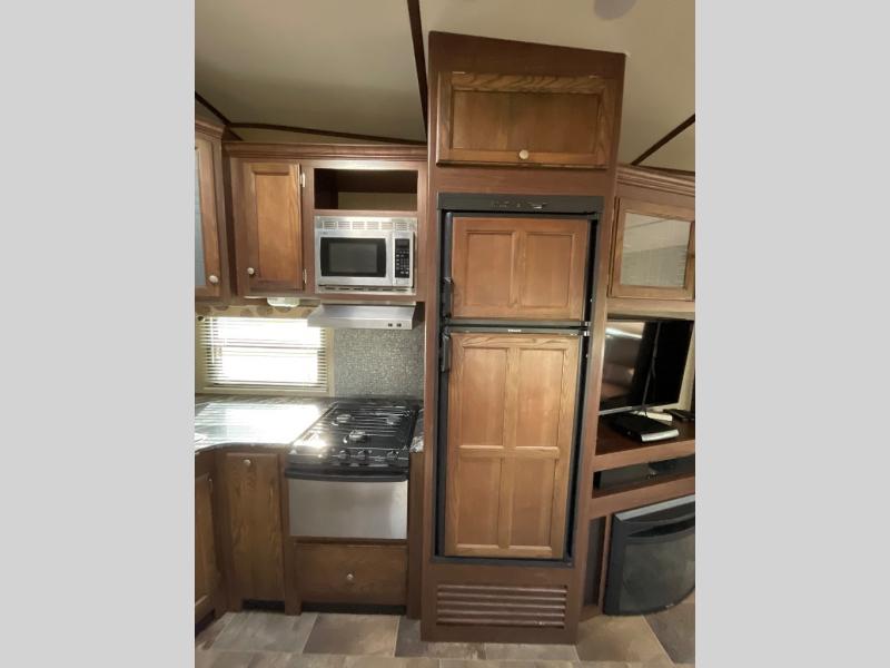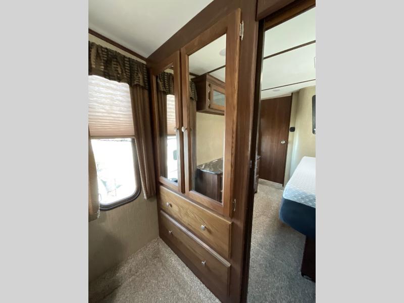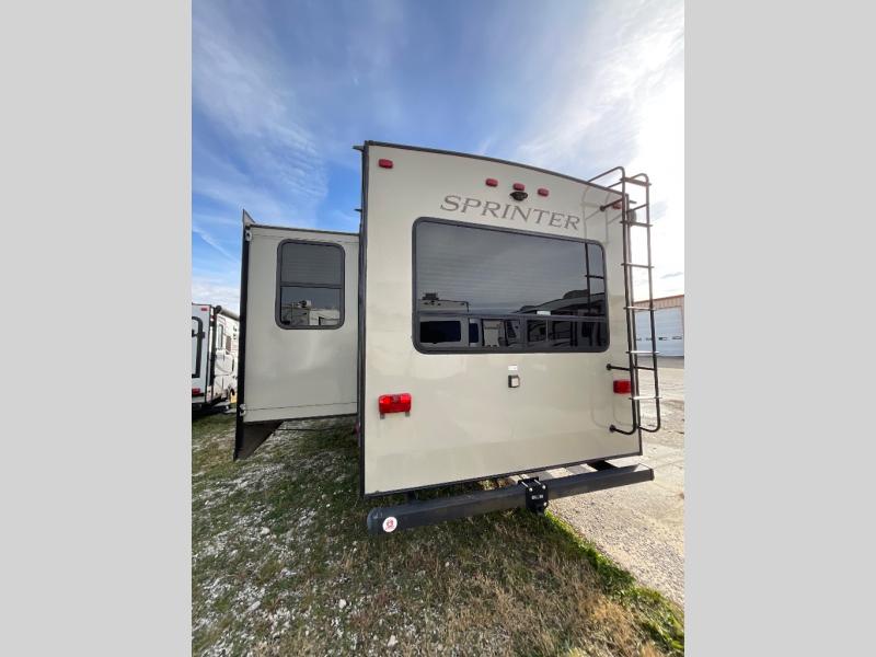 This Sprinter fifth wheel model 269FWRLS features a wide body design with an 8'4" width for added space. You will enjoy a rear living layout, double slides with the living area slide being 42" deep, and a fireplace also!