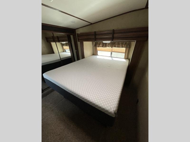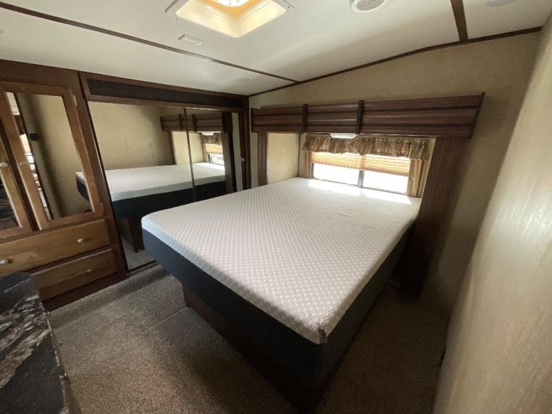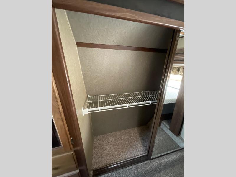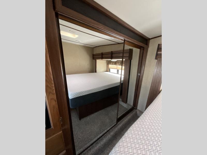 The private front bedroom features a slide out residential queen bed with overhead storage on the opposite side, and a full front wardrobe with sliding doors, a closet, and so much more!