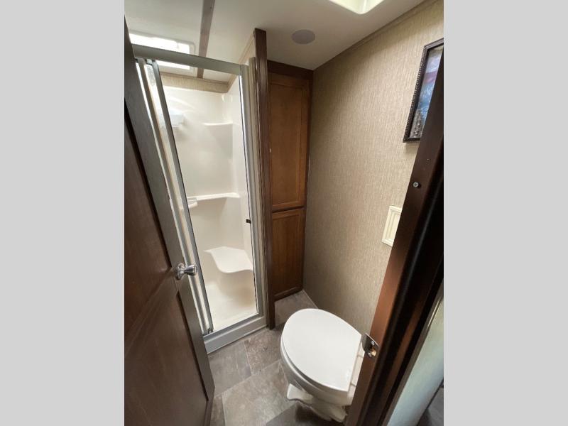 Step up to a side aisle bath and front bedroom. The bath features a residential shower, toilet, sink, and linen cabinet.