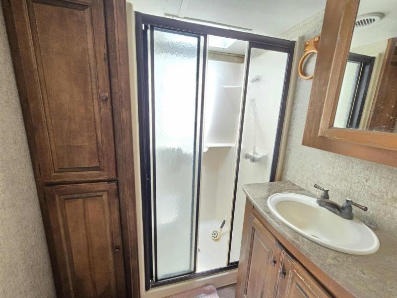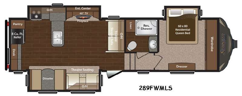 Enter and find a wide open combined living and kitchen area with dual opposing slides. There are theater seats for two and a booth dinette to the left of the door. Straight ahead enjoy additional seating with a tri-fold sleeper sofa that can easily become sleeping space for overnight guests. Adjacent to the tri-fold is a slide out entertainment center with 40" TV and fireplace to enjoy, as well as part of the kitchen area.