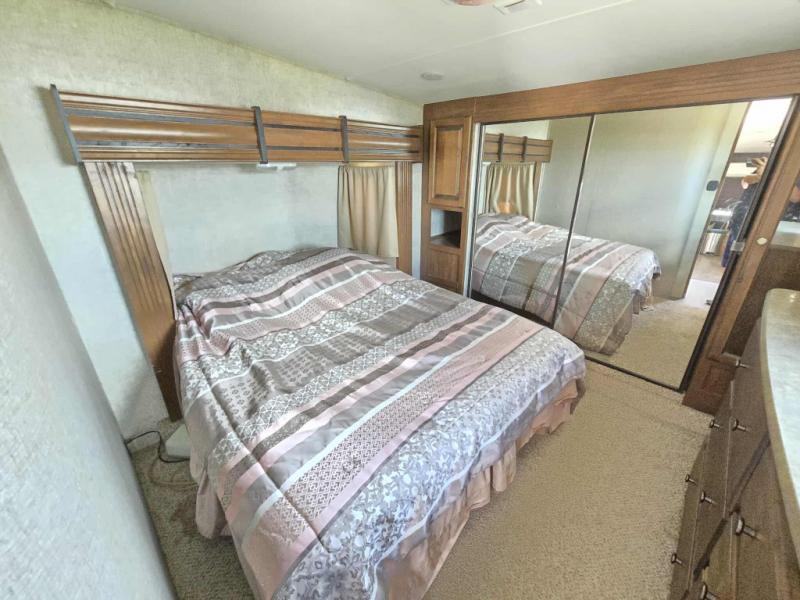 Just outside the bathroom door find the entry to the front private master retreat. This room is quite spacious and features a slide out residential queen bed, a full front wall wardrobe with sliding doors, and a dresser opposite the bed for more clothing storage, and so much more!
