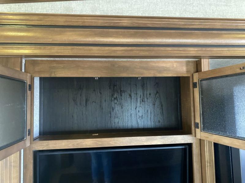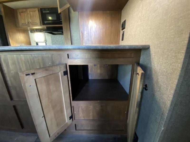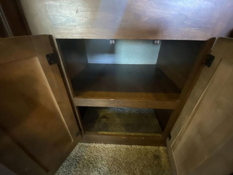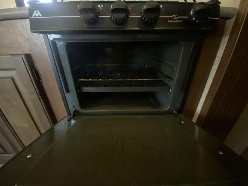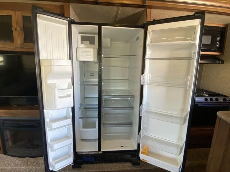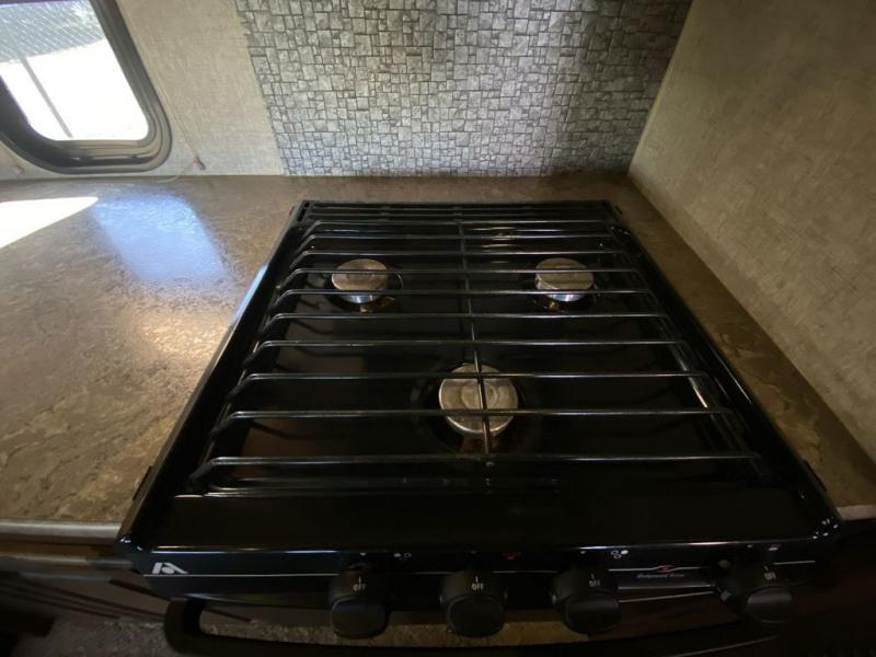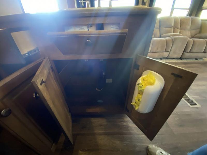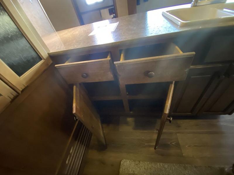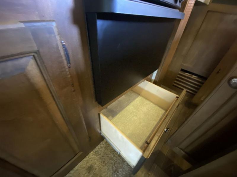 The kitchen provides everything you need to prepare and cook food for your family. There is a large L-shaped counter area with a double sink on the end, overhead cabinets for all of your dishes and things, plus a slide out along the road side that includes a three burner range and 18 cu. ft. residential refrigerator. You will also find more storage space near the entertainment center that is mentioned above, plus so much more!