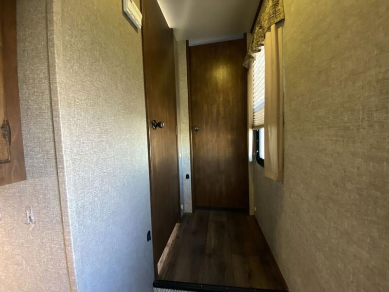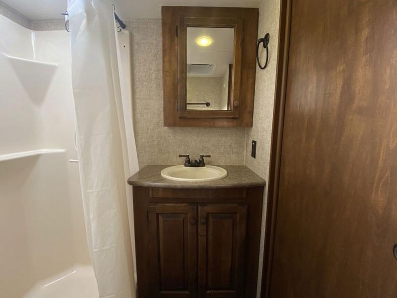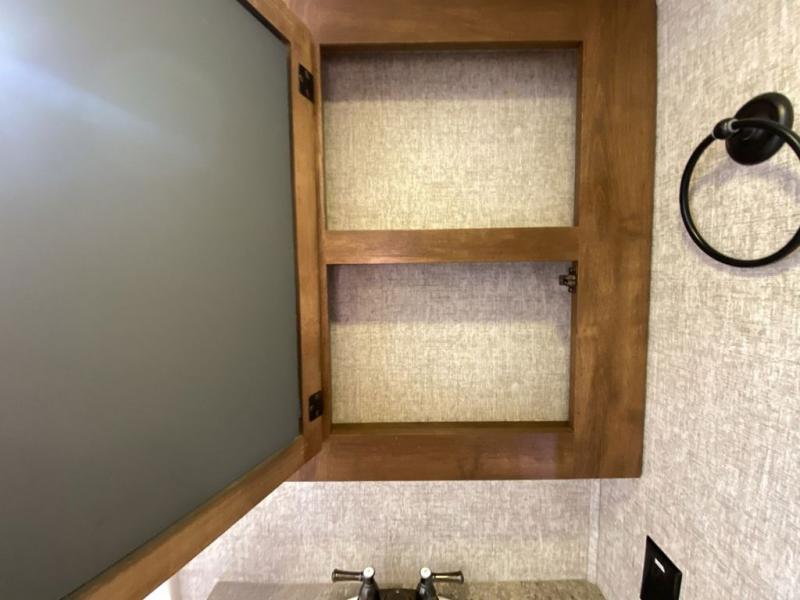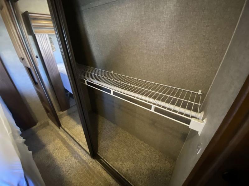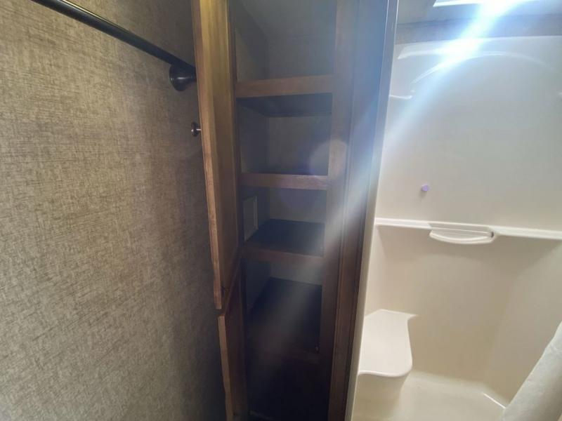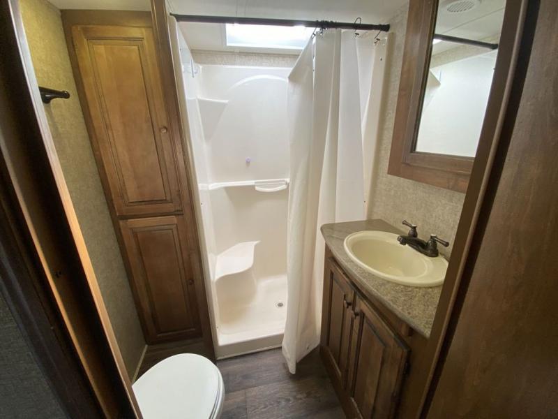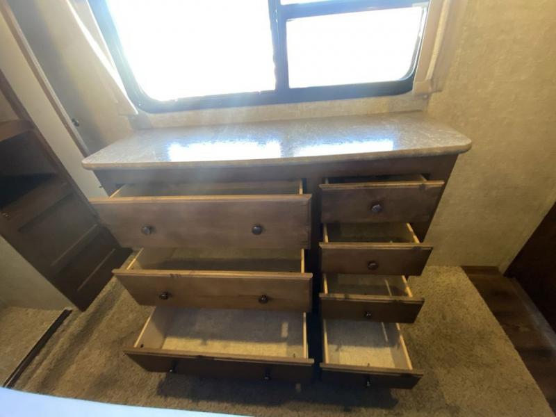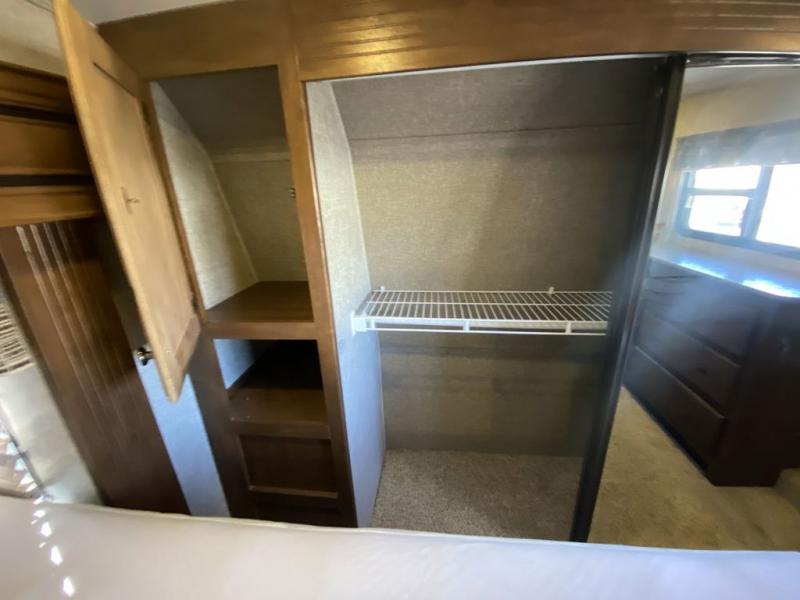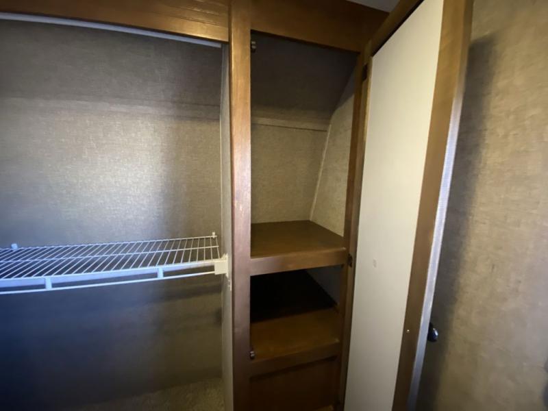 Enter model 298FWRLS and head up the steps on your right to the front master bedroom and side aisle bath. The bathroom offers a residential shower, toilet, sink, and linen cabinet. The private master bedroom at the end of the hall features a slide out residential queen size bed. There is also a dresser opposite, plus a front wall wardrobe and closet for all of your clothing and storage needs.