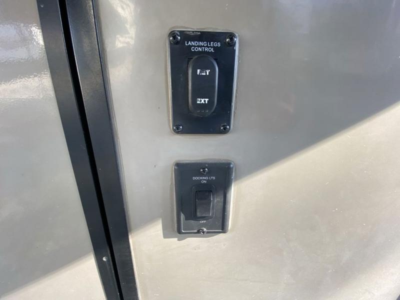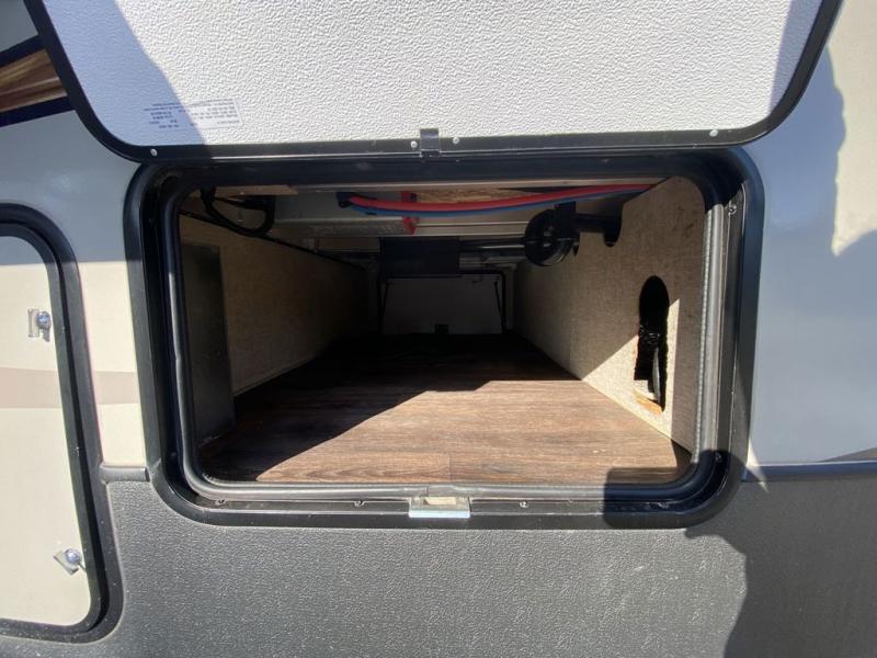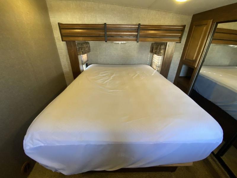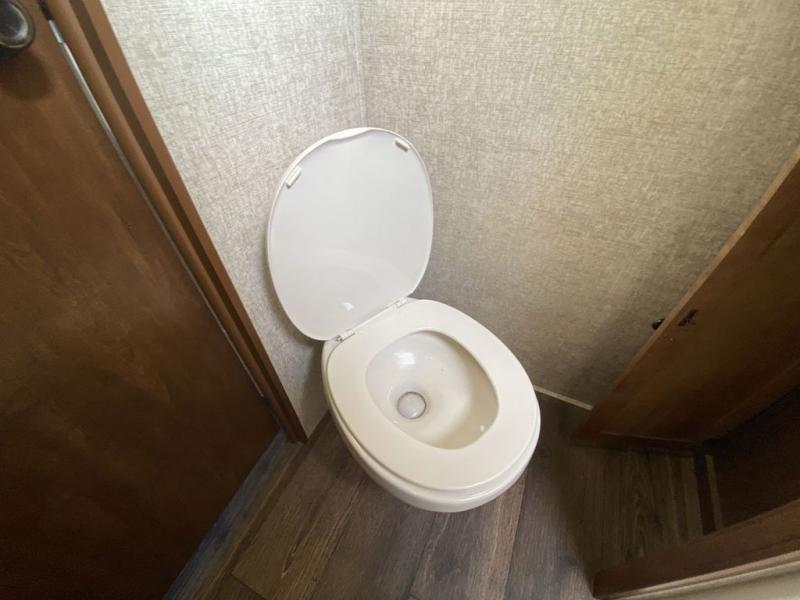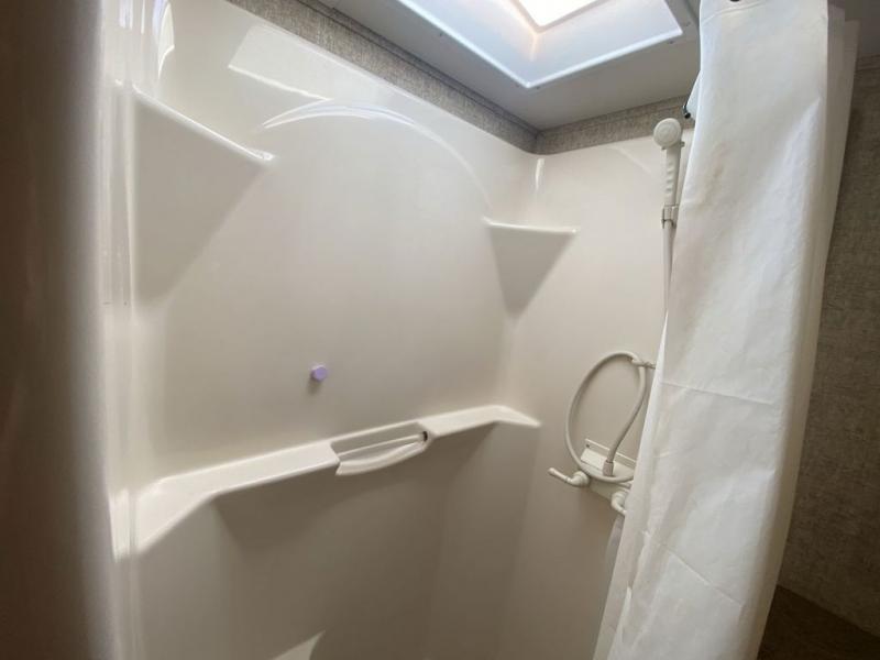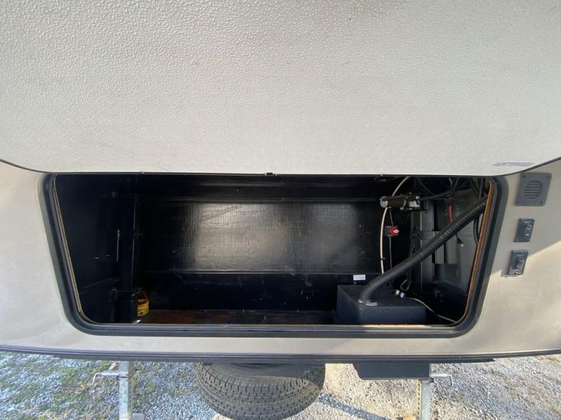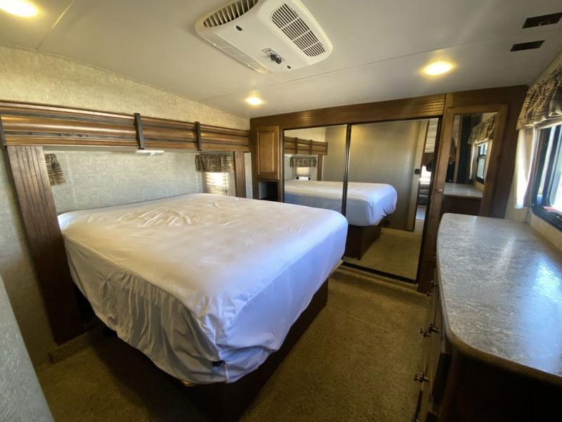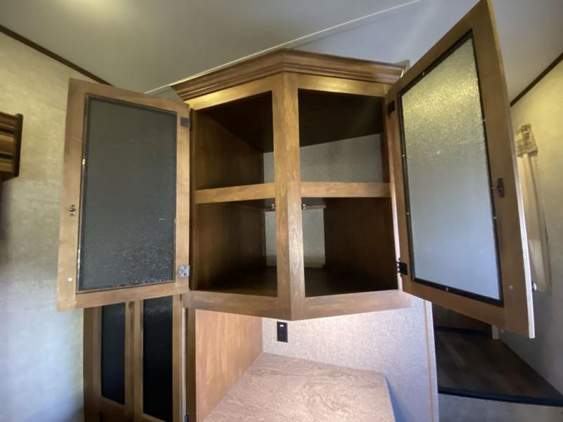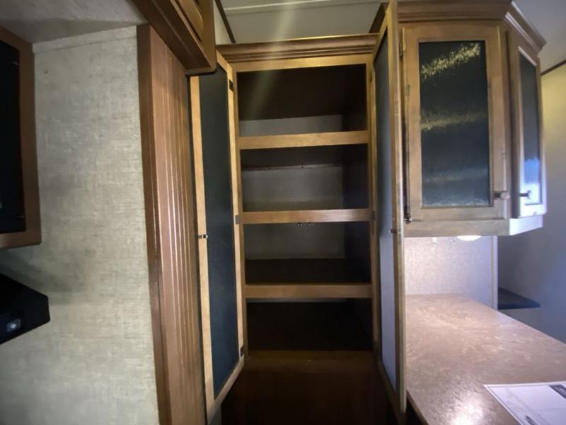 Enter model 298FWRLS and head up the steps on your right to the front master bedroom and side aisle bath. The bathroom offers a residential shower, toilet, sink, and linen cabinet. The private master bedroom at the end of the hall features a slide out residential queen size bed. There is also a dresser opposite, plus a front wall wardrobe and closet for all of your clothing and storage needs.