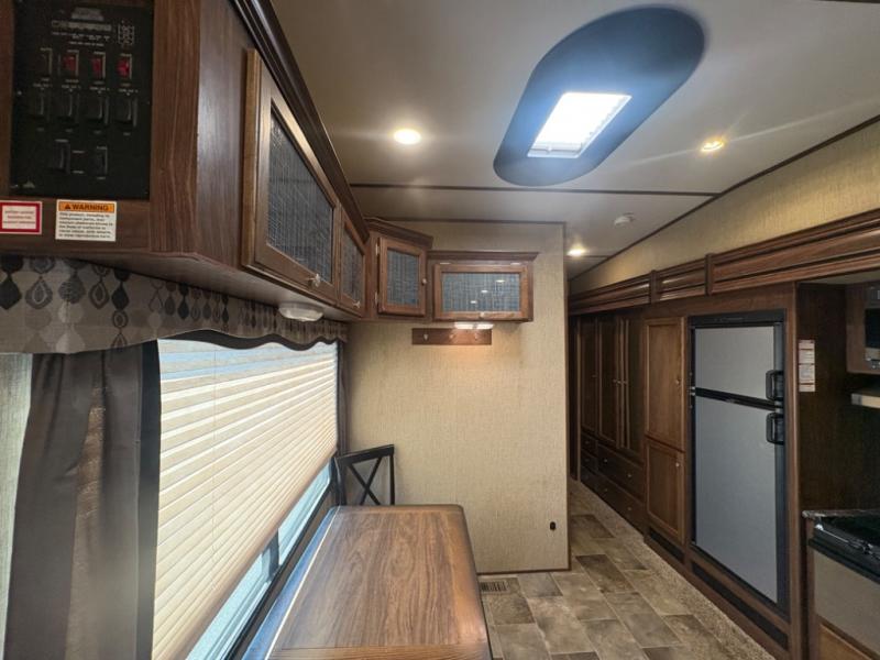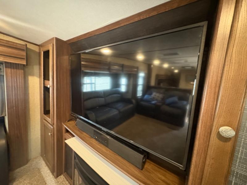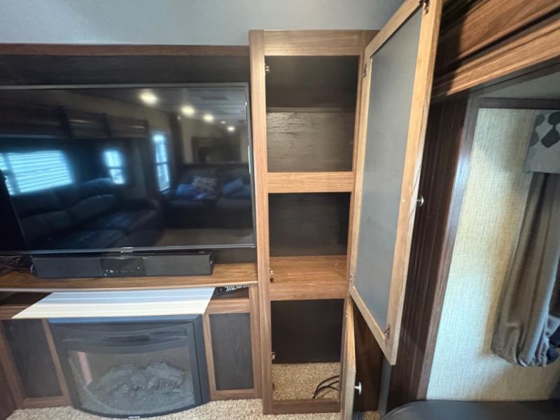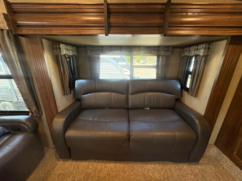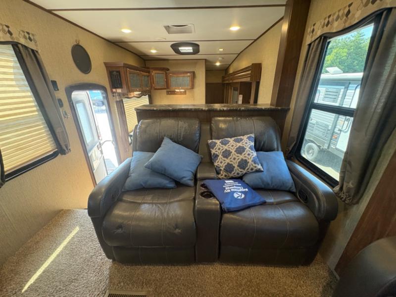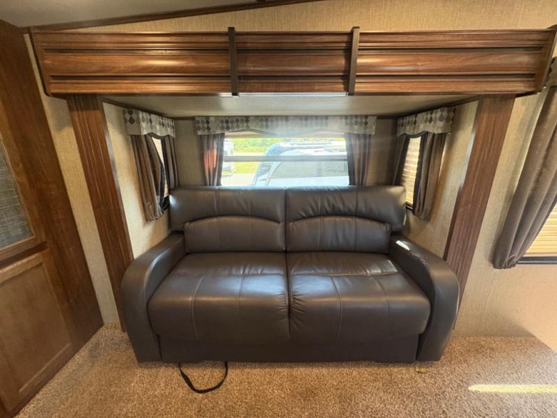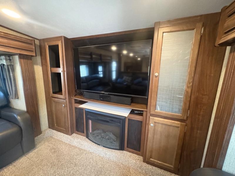 Head up the steps towards the front of the fifth wheel to a raised living area which is perfect for entertaining guests. There is theater seating, dual slide out tri-fold sleeper sofas, and a front wall entertainment center with 40" TV including a fireplace below. You will also find plenty of floor space for the kids to sprawl out and enjoy a family movie, plus so much more!