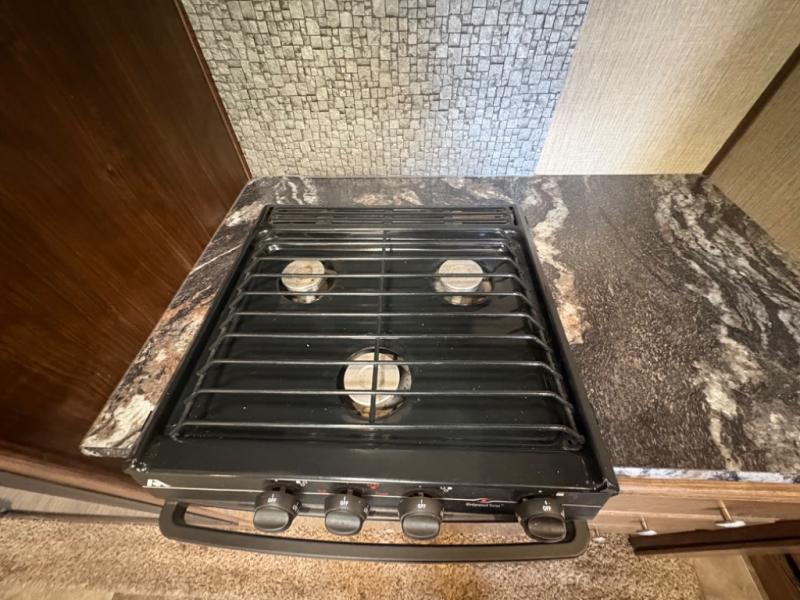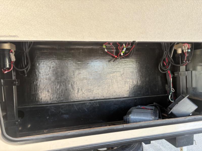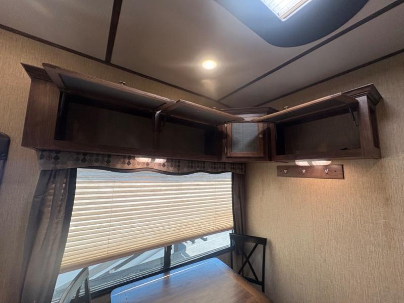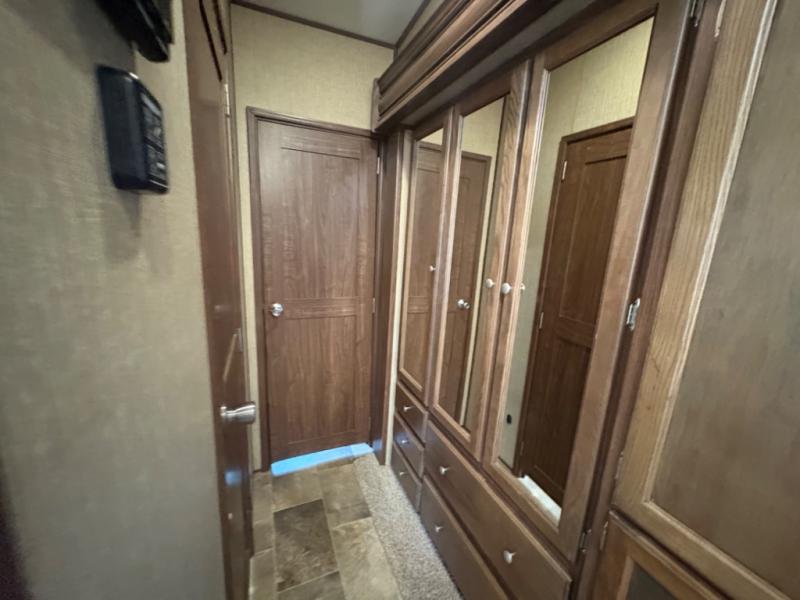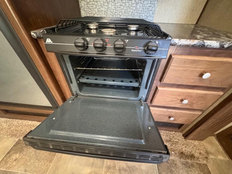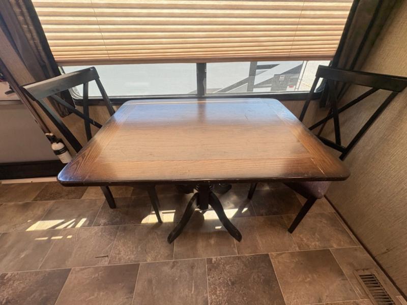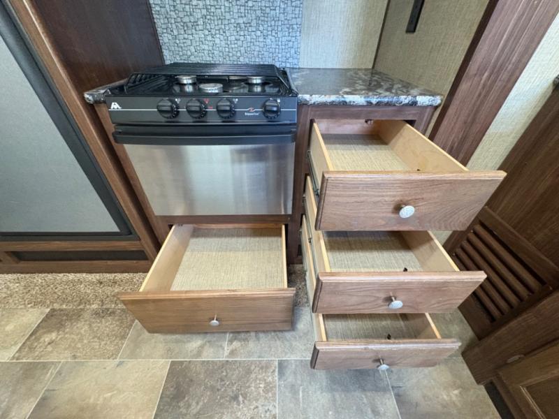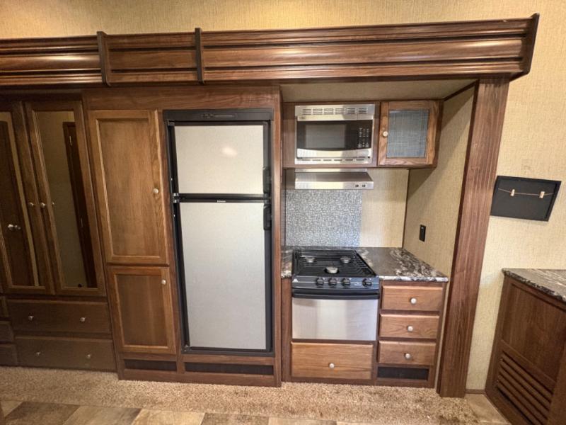 Head up the steps towards the front of the fifth wheel to a raised living area which is perfect for entertaining guests. There is theater seating, dual slide out tri-fold sleeper sofas, and a front wall entertainment center with 40" TV including a fireplace below. You will also find plenty of floor space for the kids to sprawl out and enjoy a family movie, plus so much more!