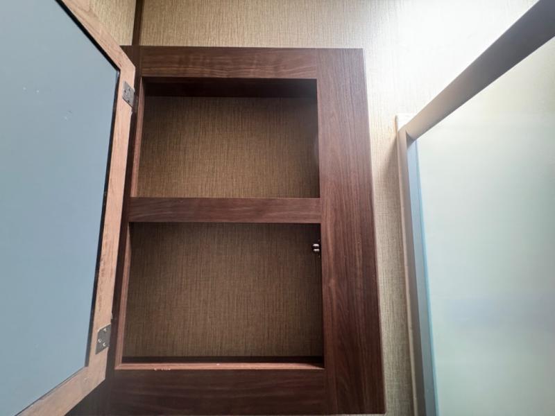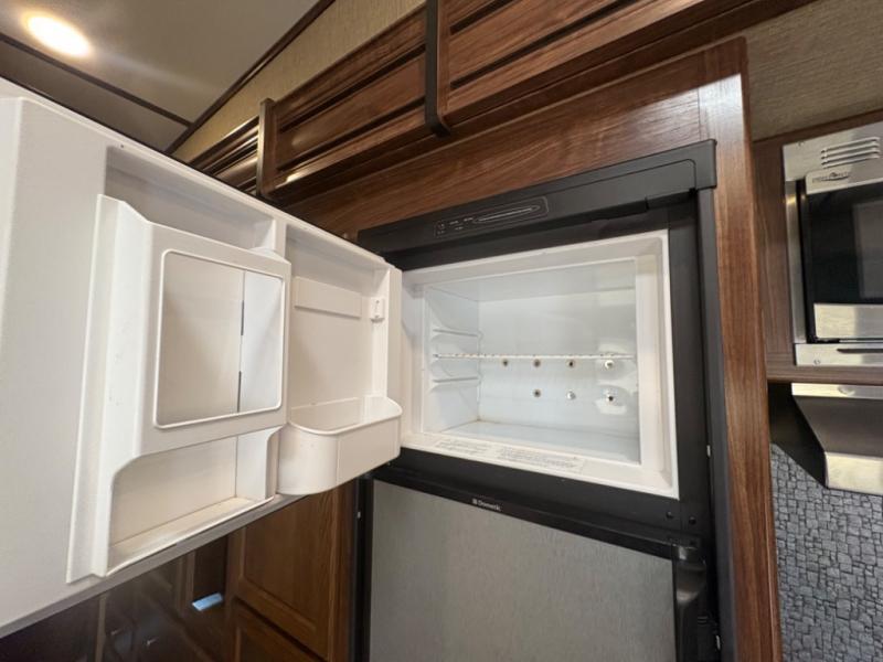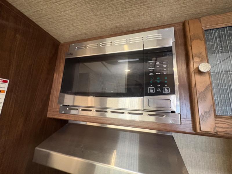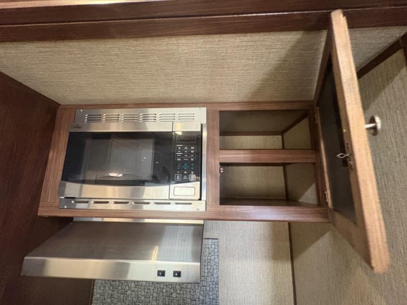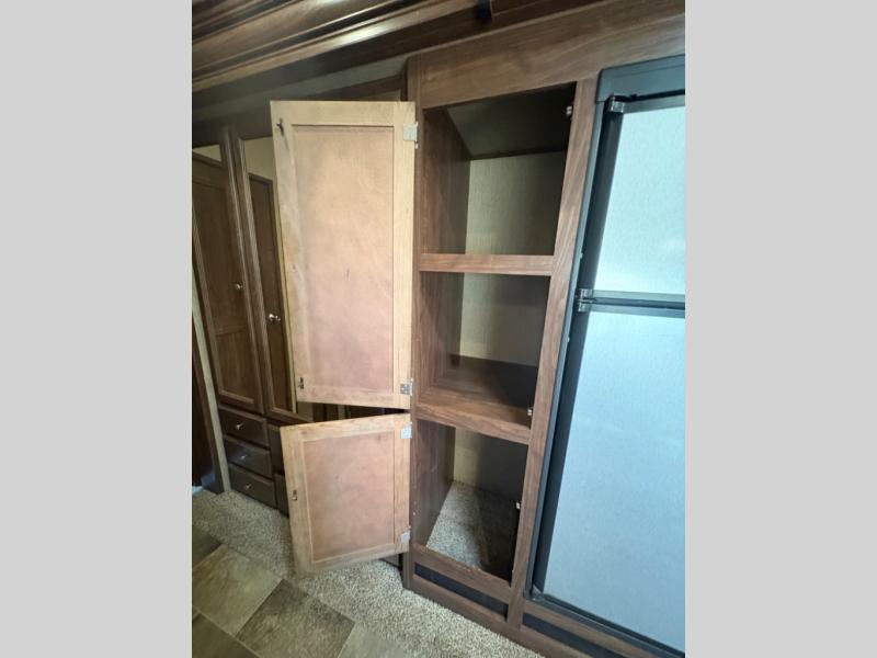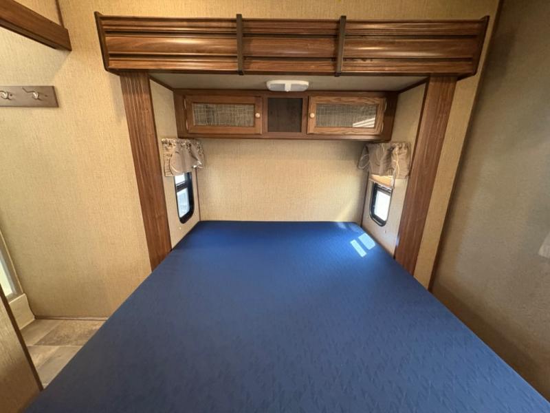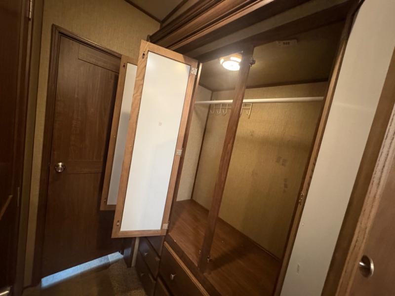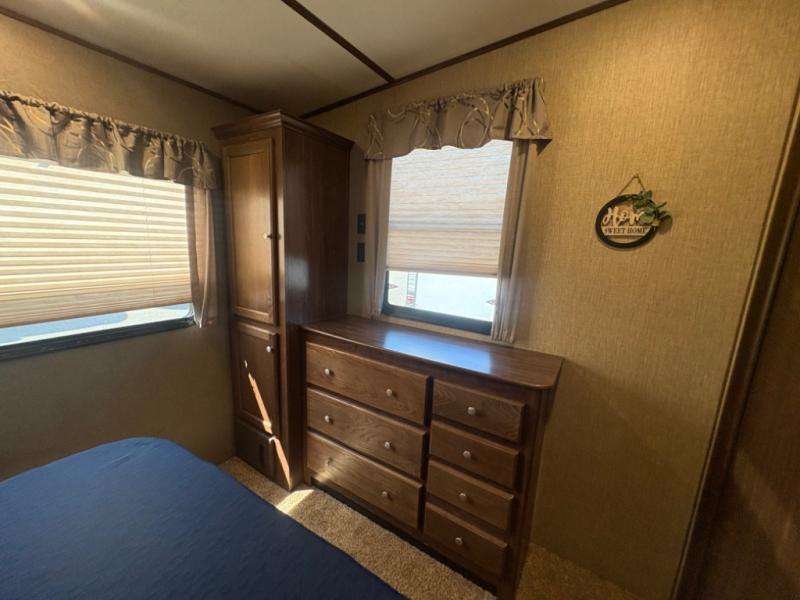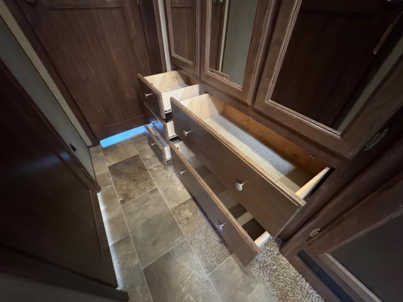 The master bedroom features a quiet retreat away from it all where you can enjoy a slide out residential queen size bed, dresser, cabinet, and overhead storage. Remember there is more wardrobe storage directly across from the bathroom.