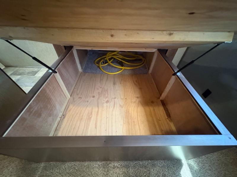 Enter and find yourself in the kitchen area with a dining table and four chairs to your immediate left. There is overhead storage for your dishes and food items, plus lower cupboards as well. Straight in from the door find a kitchen sink, counter space, and more storage up above. Along the wall opposite the door side there is a slide out three burner range, 8 cu. ft. refrigerator, pantry, and a wardrobe.