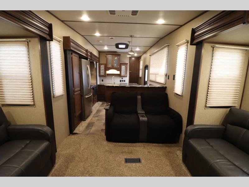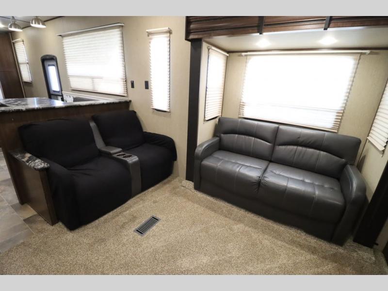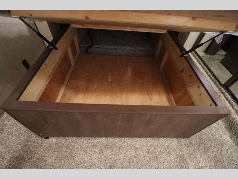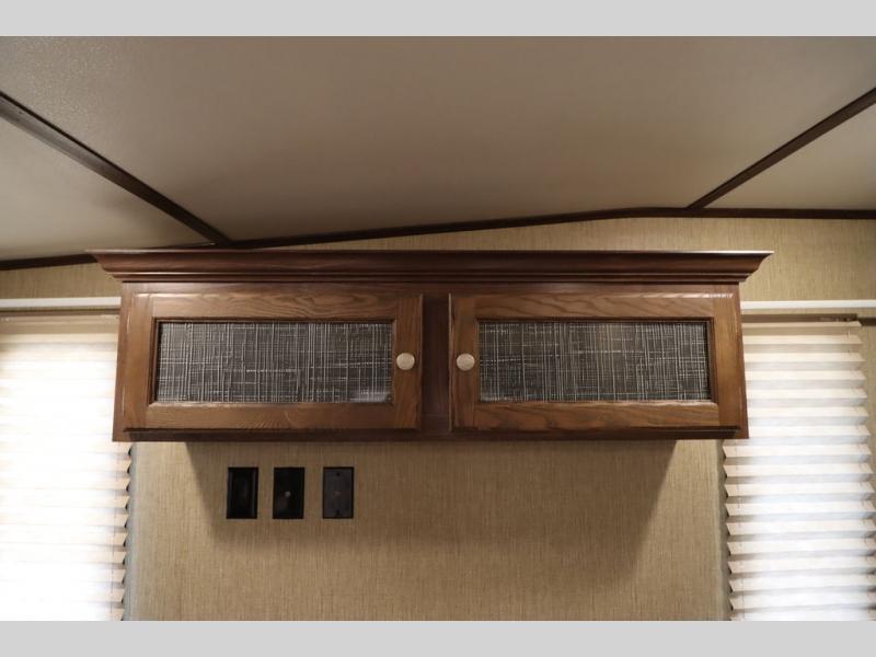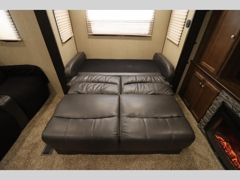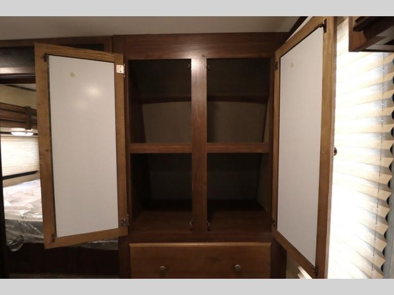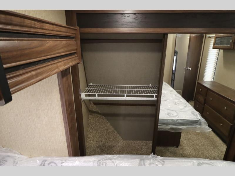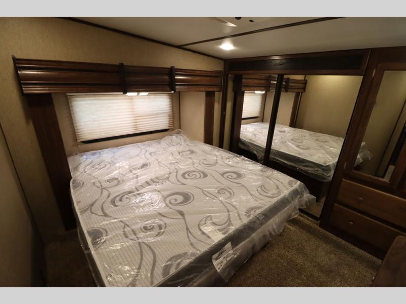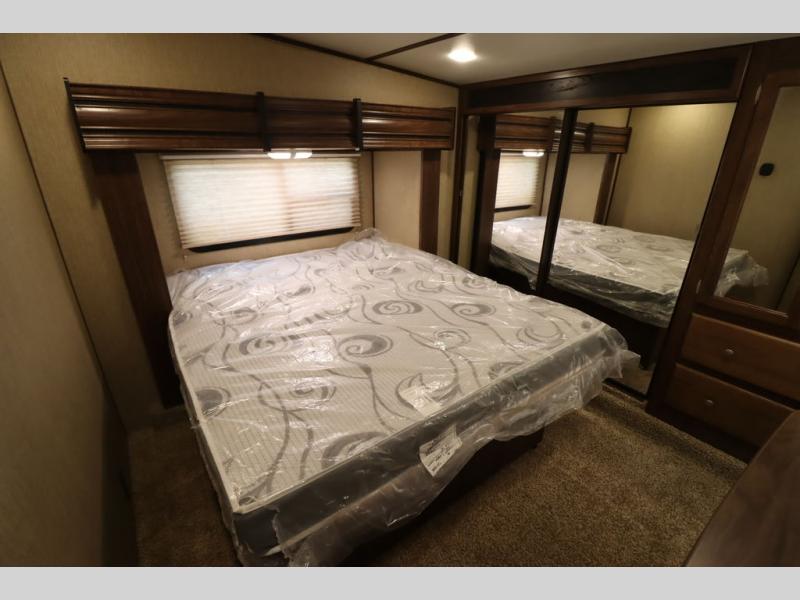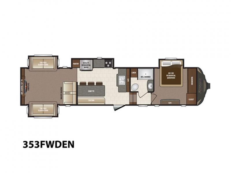 Enter model 353FWDEN and head up the steps on your right to the front master bedroom and side aisle bath. The bathroom offers a residential shower, toilet, sink, and linen cabinet. The private master bedroom at the end of the hall features a slide out residential queen size bed. There is also a dresser opposite, and full front wall wardrobe and closet for all of your clothing storage needs.