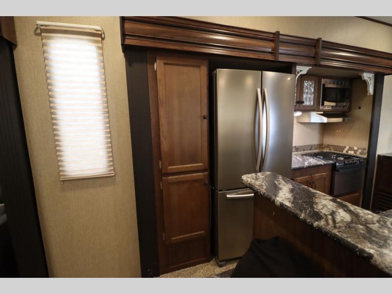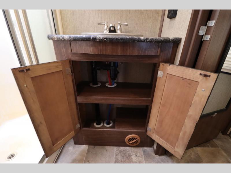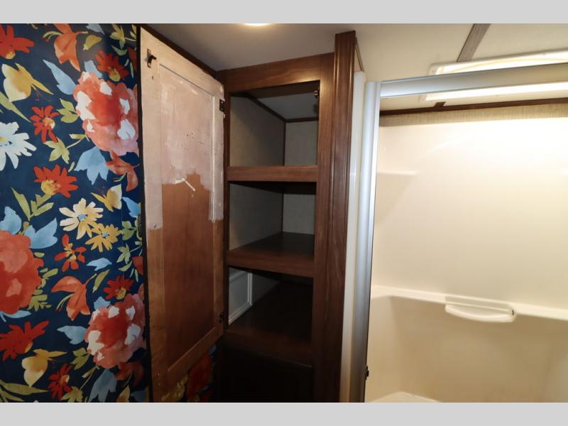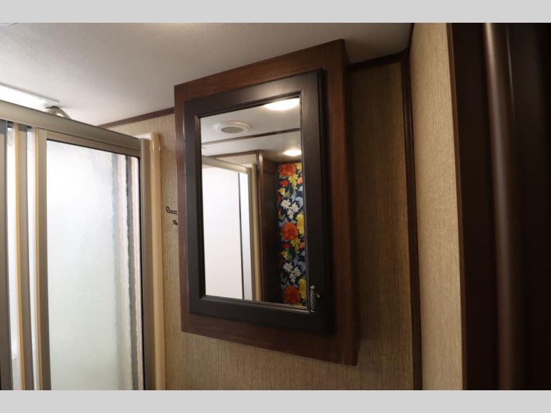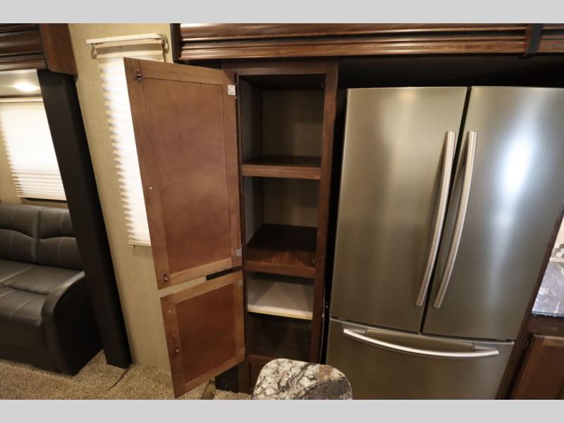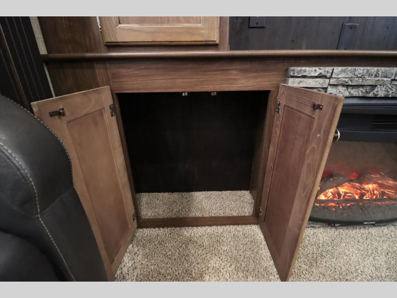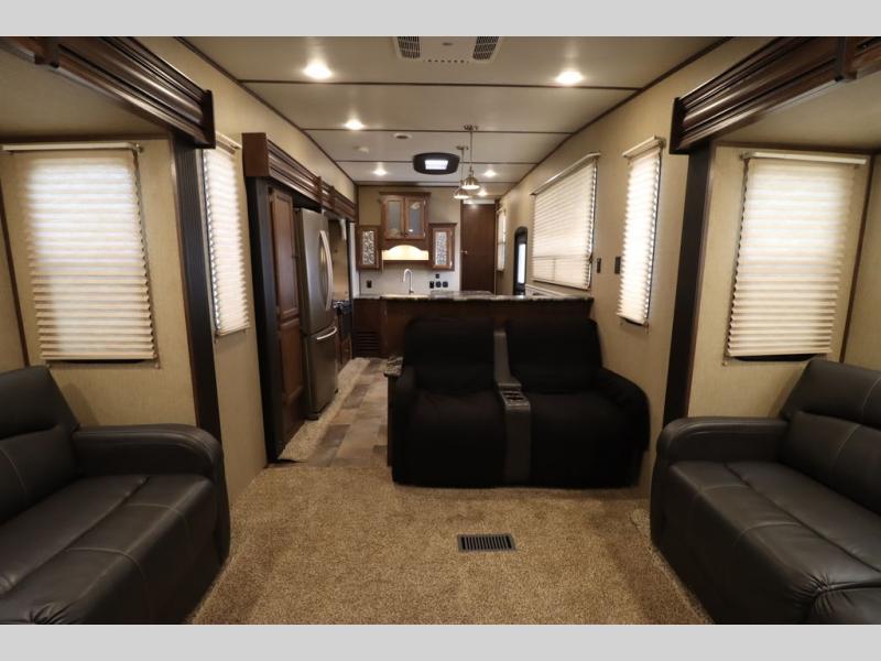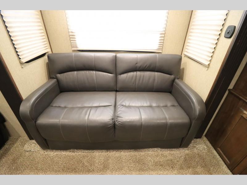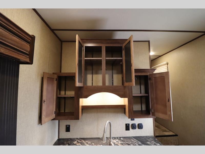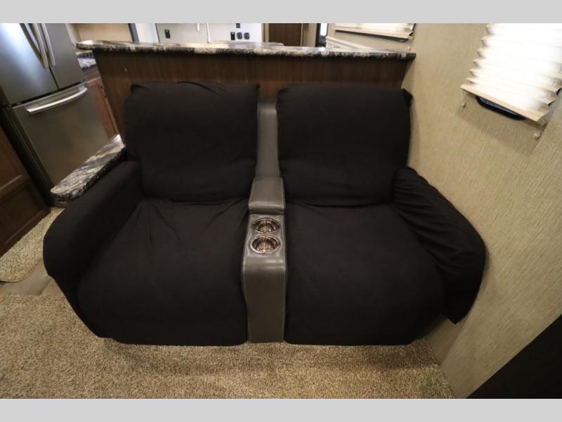 Enter model 353FWDEN and head up the steps on your right to the front master bedroom and side aisle bath. The bathroom offers a residential shower, toilet, sink, and linen cabinet. The private master bedroom at the end of the hall features a slide out residential queen size bed. There is also a dresser opposite, and full front wall wardrobe and closet for all of your clothing storage needs.