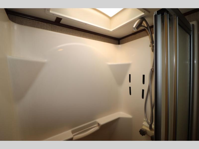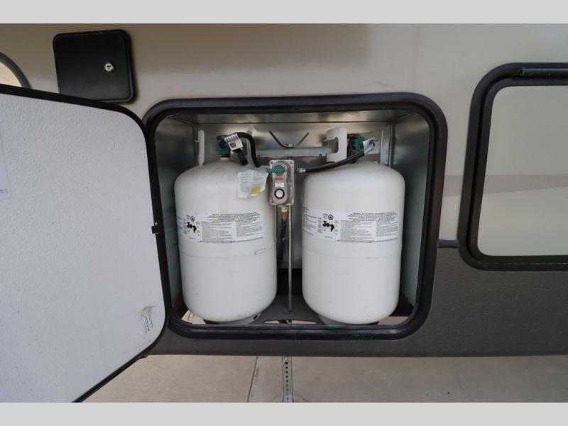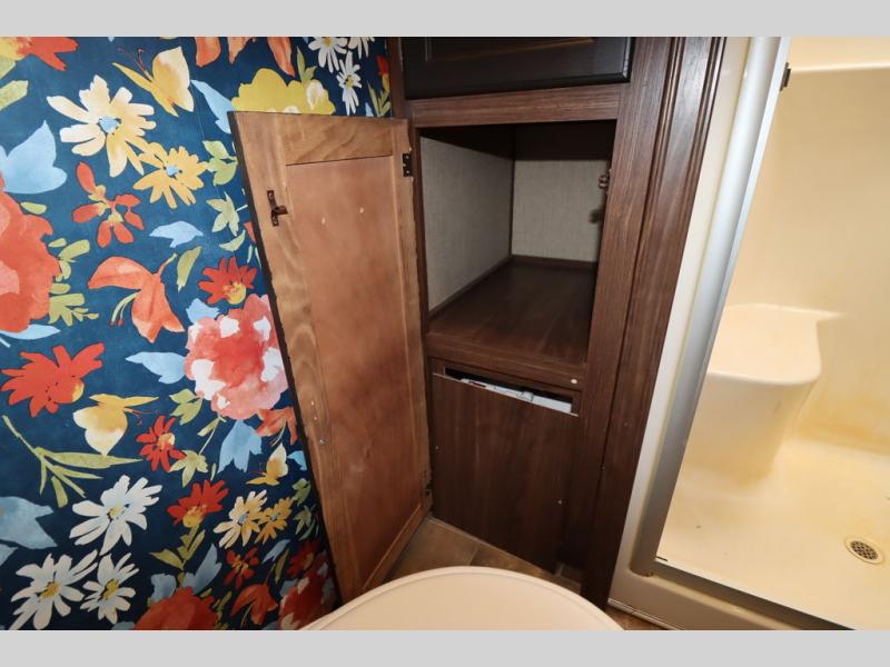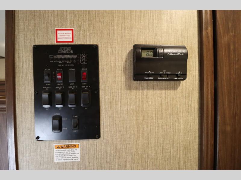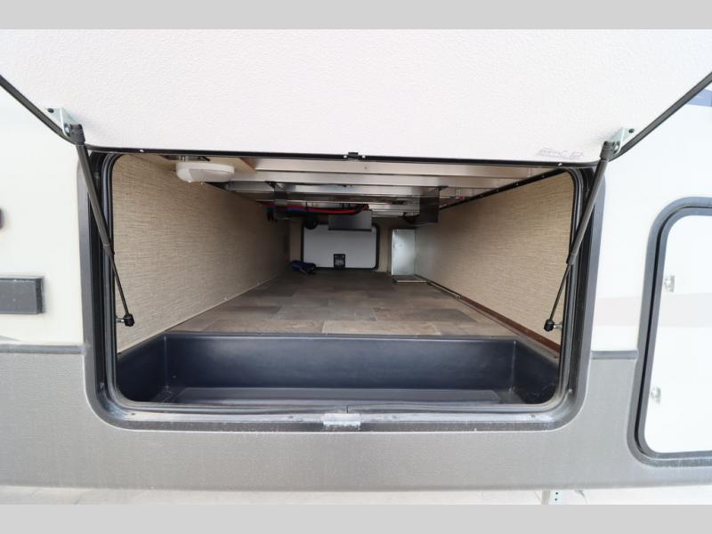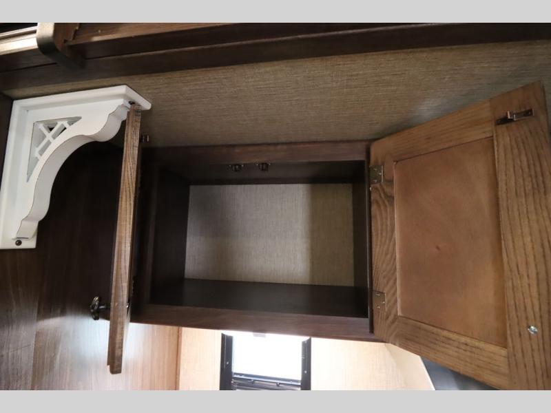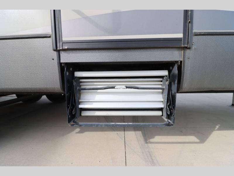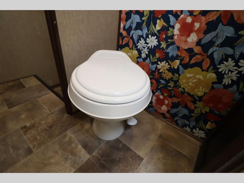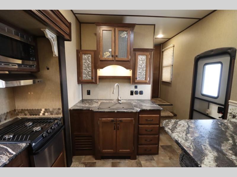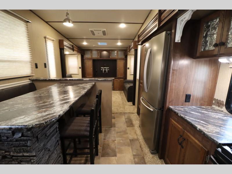 Enter model 353FWDEN and head up the steps on your right to the front master bedroom and side aisle bath. The bathroom offers a residential shower, toilet, sink, and linen cabinet. The private master bedroom at the end of the hall features a slide out residential queen size bed. There is also a dresser opposite, and full front wall wardrobe and closet for all of your clothing storage needs.
