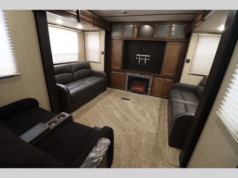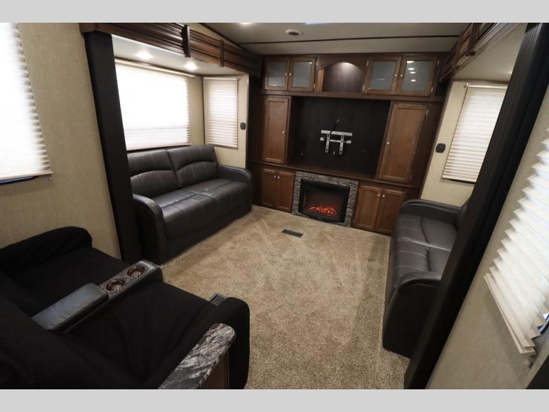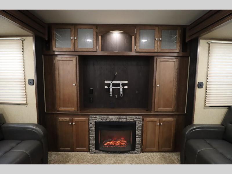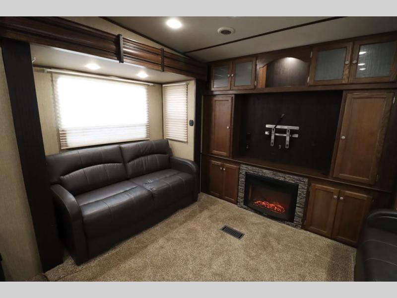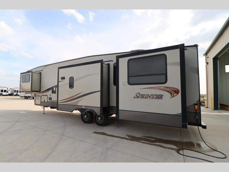 This Keystone Sprinter fifth wheel features a wide body design with quadruple slides which increases the size even more when all slides are fully extended. You are sure to love the den area with the rear entertainment center and fireplace.
