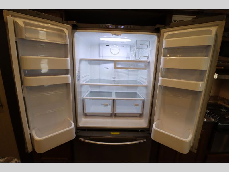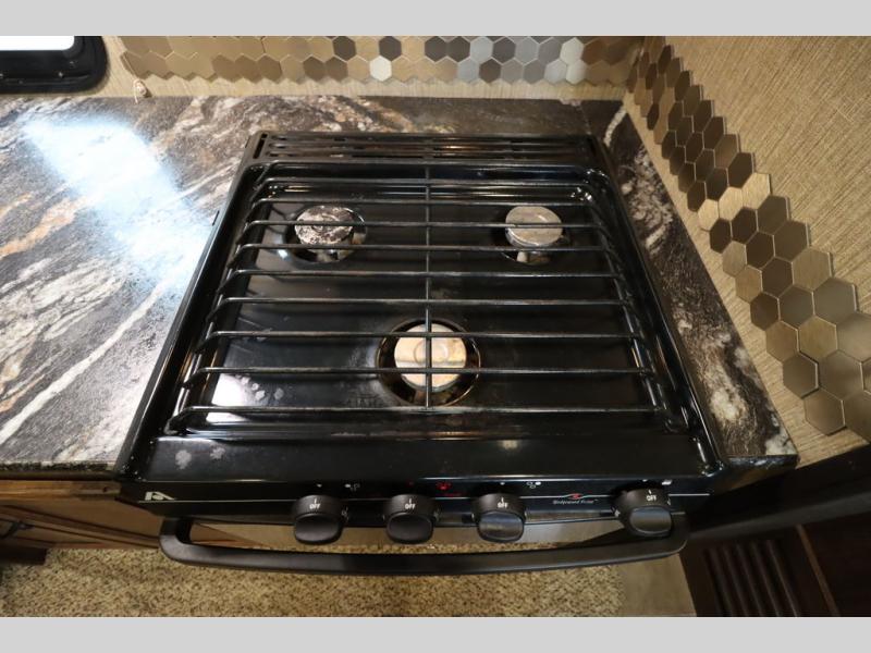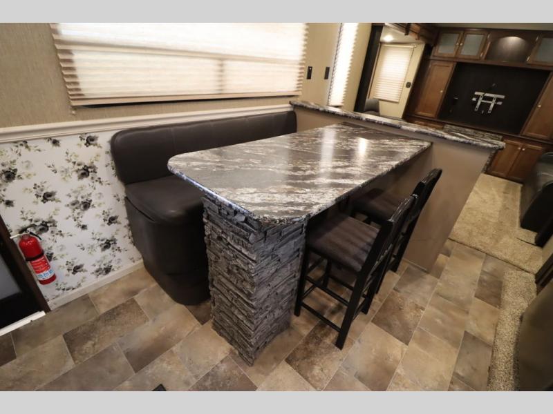 Heading towards the kitchen area you will find a dinette with booth seating along the curb side wall and three chairs on the opposite side. Along the interior wall is a double sink with counter space on both sides plus overhead storage for your dishes and things. The kitchen continues to provide everything you need to prepare and cook food for your family with a slide out three burner range, 18 cu. ft. residential refrigerator, and a pantry for your non-perishables.