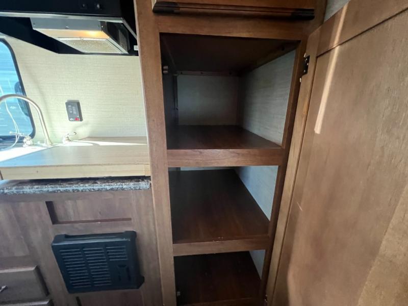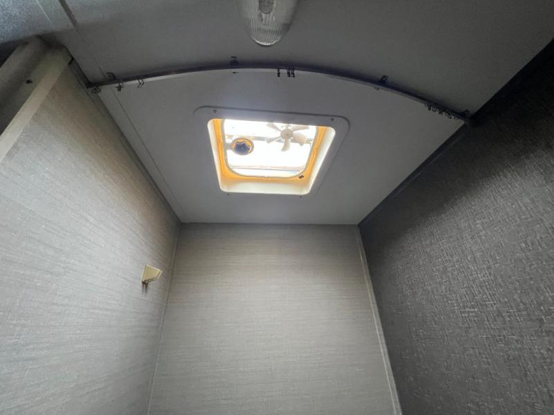 Step inside and notice the front queen bed with full front overhead storage, and a closet at the foot of the bed as the bed is turned width wise with the head of the bed along the road side wall. You will find plenty of storage beneath the queen bed as well.