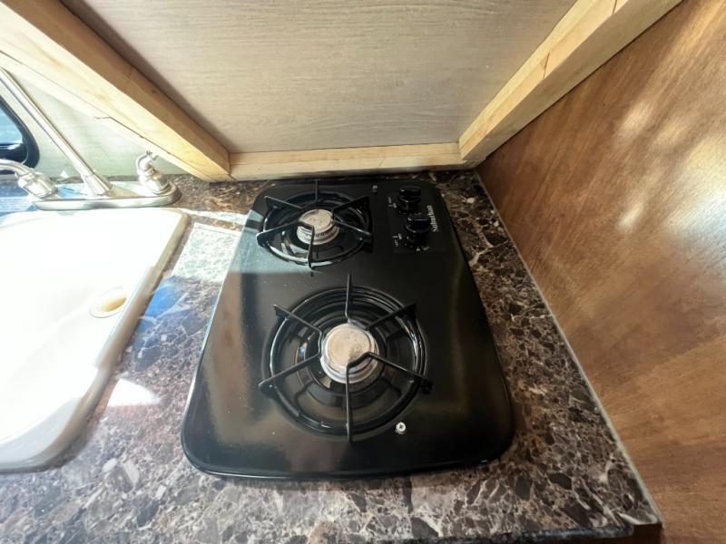 The kitchen area is to the left of the entry door and features counter space, overhead cabinets, an overhead microwave oven, a two burner cooktop, and food storage pantry.