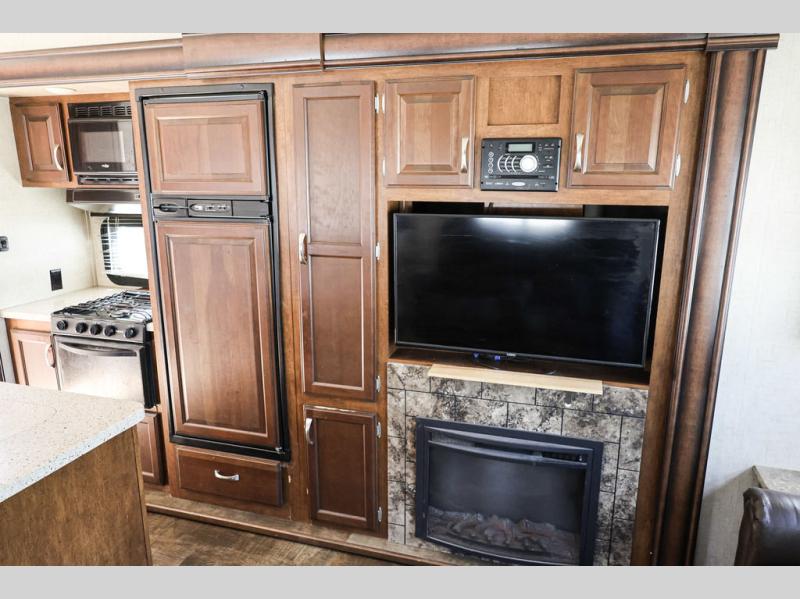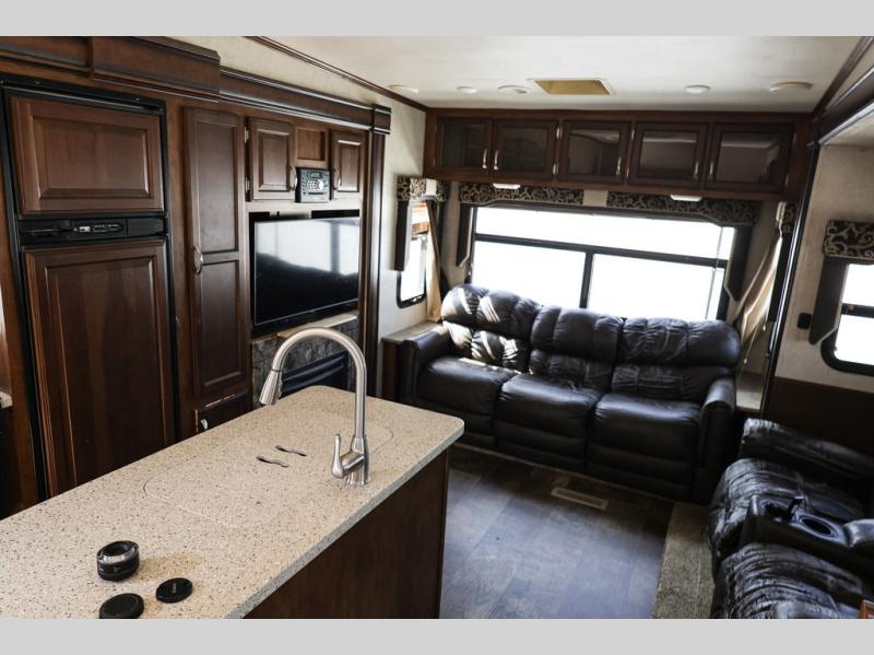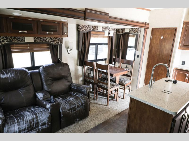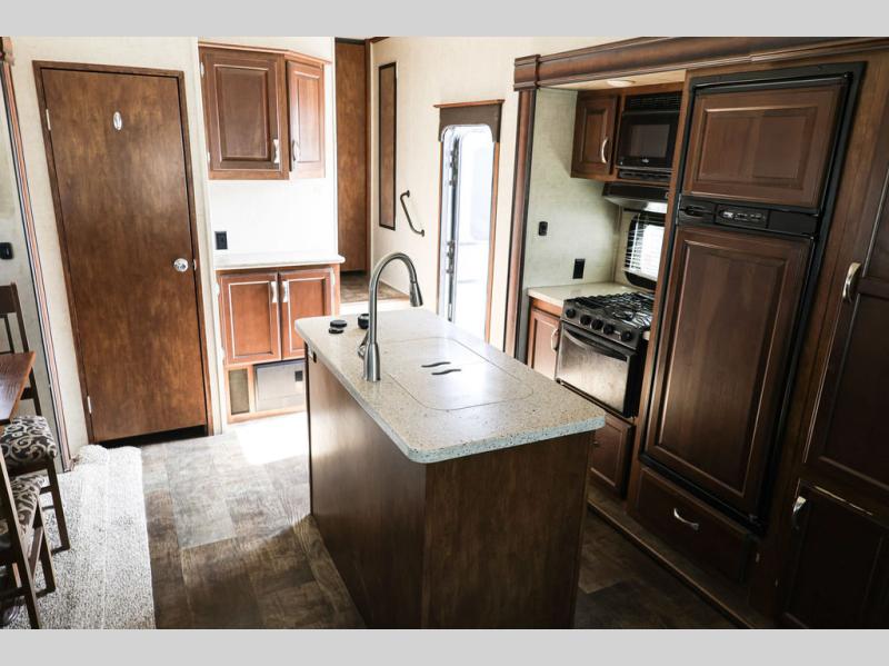 In the main living area you will find dual opposing slides which really help to open up this living area. The first slide has a three burner range, refrigerator, and overhead cabinet. On the same slide as the refrigerator you will find an interior/exterior entertainment center as well, as outside there is a refrigerator for your convenience. On the opposite side of the living area there is a slide with theater seating, an overhead cabinet above the theater seats, and a dinette. Adjacent to the slide you will find a large pantry and a hutch. Along the rear of the fifth wheel you can relax on the sofa, and above the sofa there is more storage with the overhead cabinet. In the middle of the kitchen there is an island with a double kitchen sink, and counter space around the sink, which is nice for food prep.