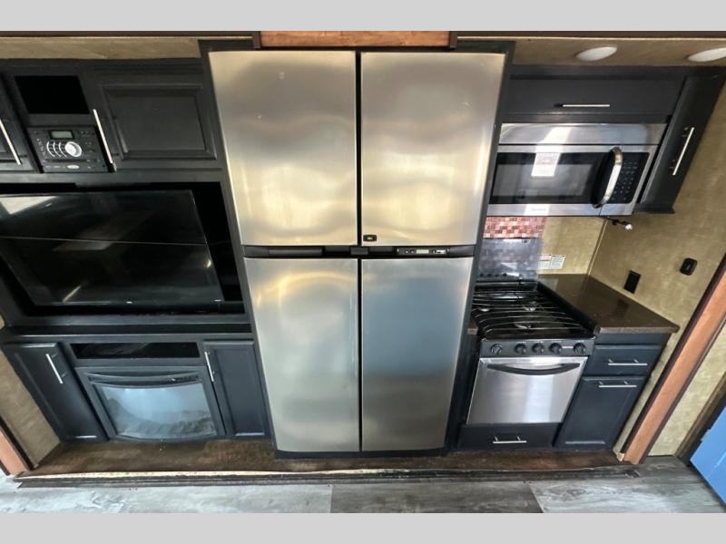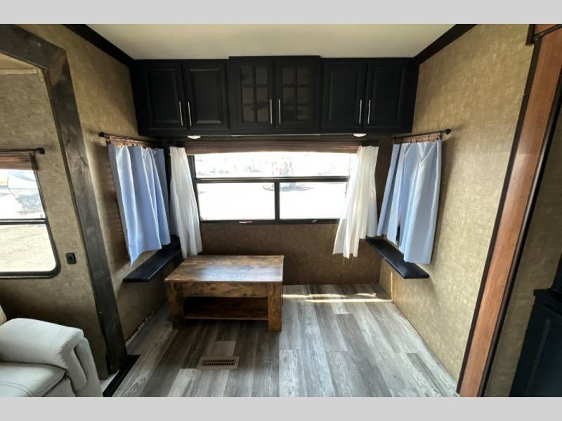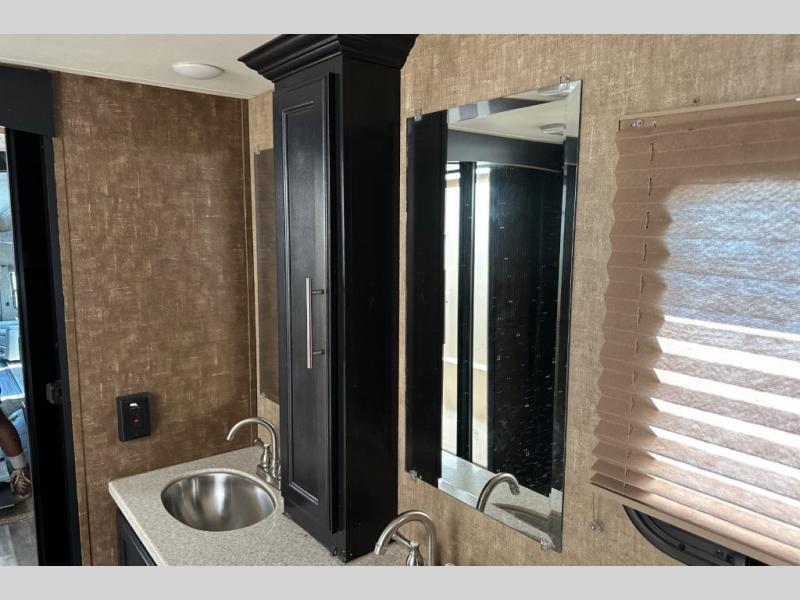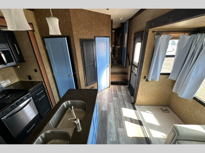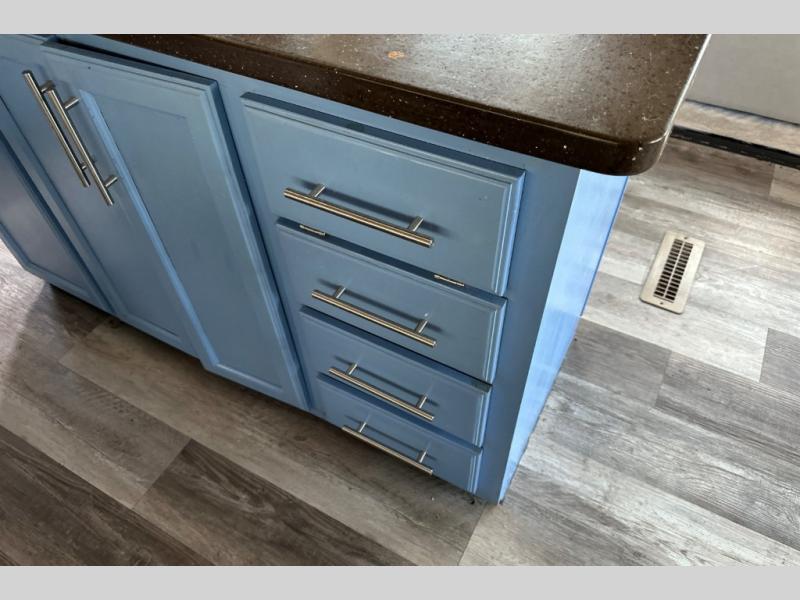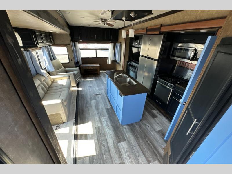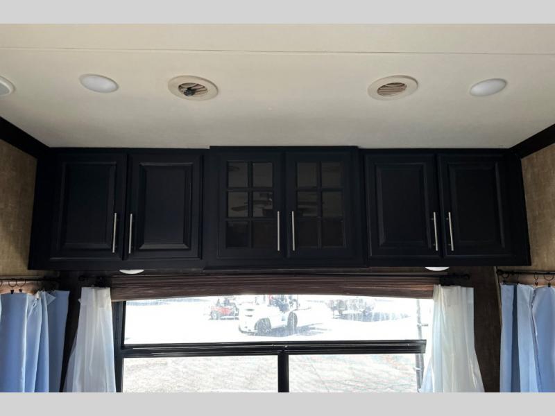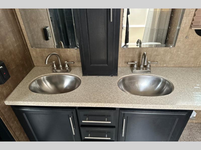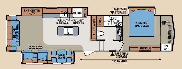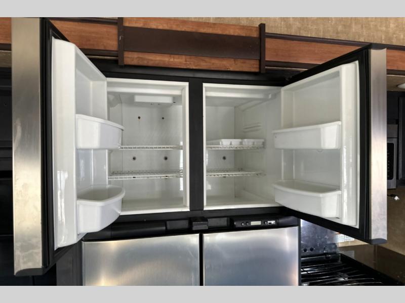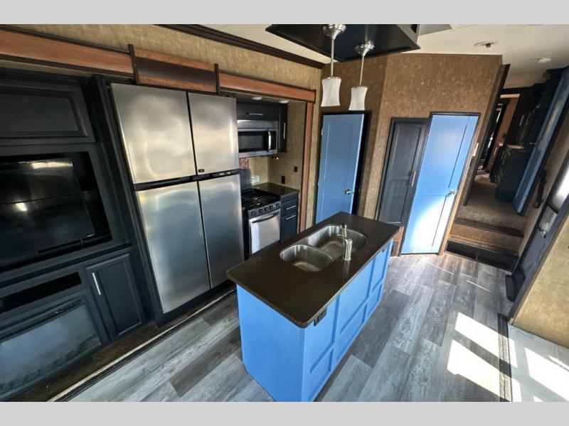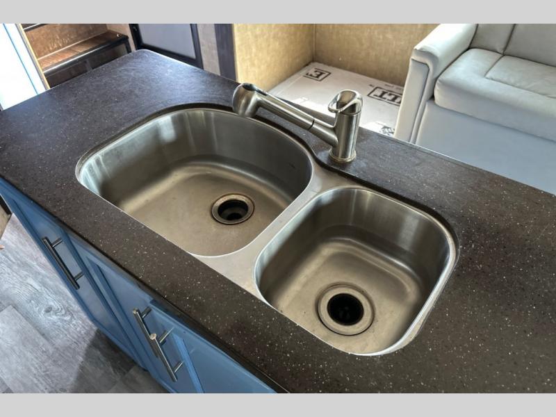 Inside the fifth wheel you will love how open and spacious this model feels. In the kitchen/living area there are slides on either side. The first slide has a free-standing table/chairs and optional theater seating. Along the rear wall you will find a deluxe sleeper sofa with end tables on either side of the sofa. The other slide has an entertainment center, plenty of counter space, a three burner range, refrigerator, pantry, pull out spice rack, and pull out trash bin. Adjacent to the slide there is a hutch with overhead cabinet. And don't forget about the kitchen island which has a double kitchen sink, surrounded by counter space which makes food prep a breeze.