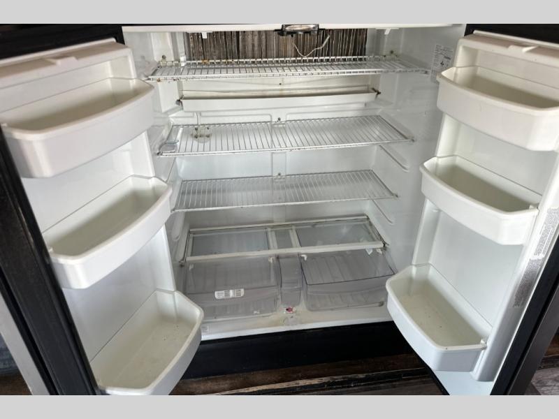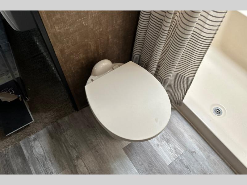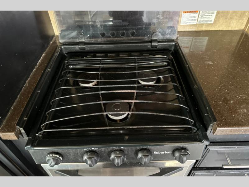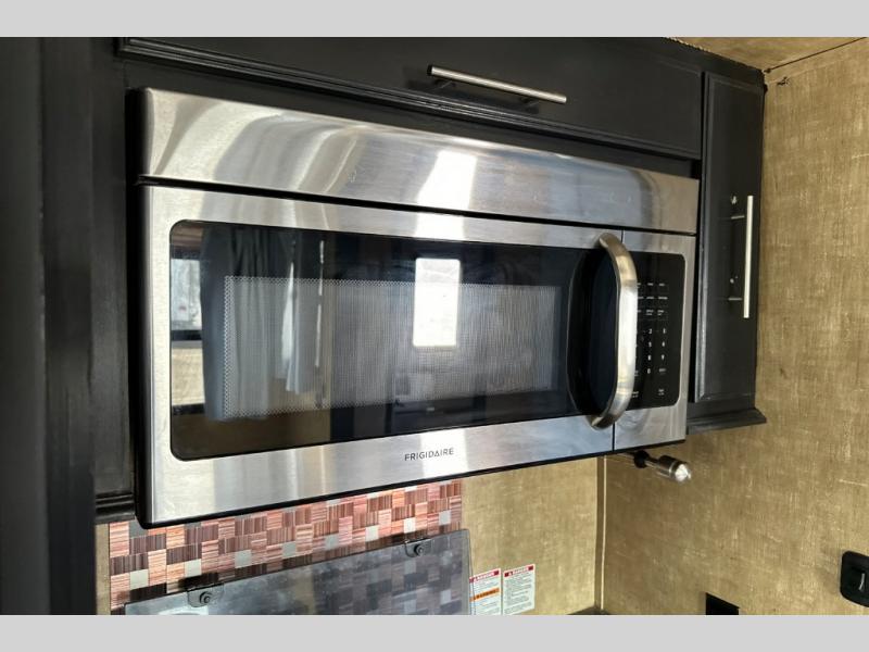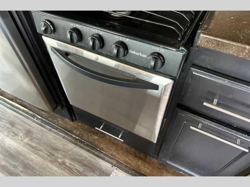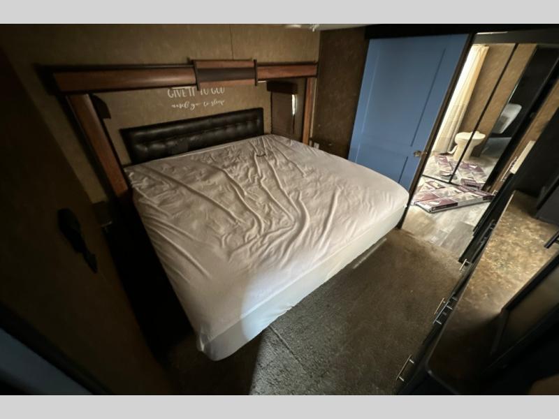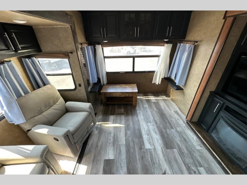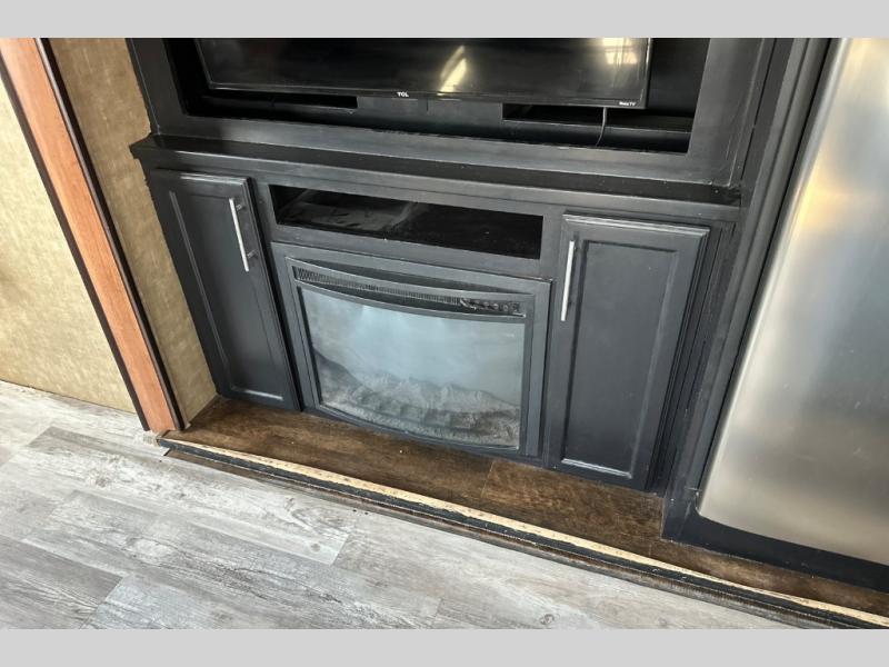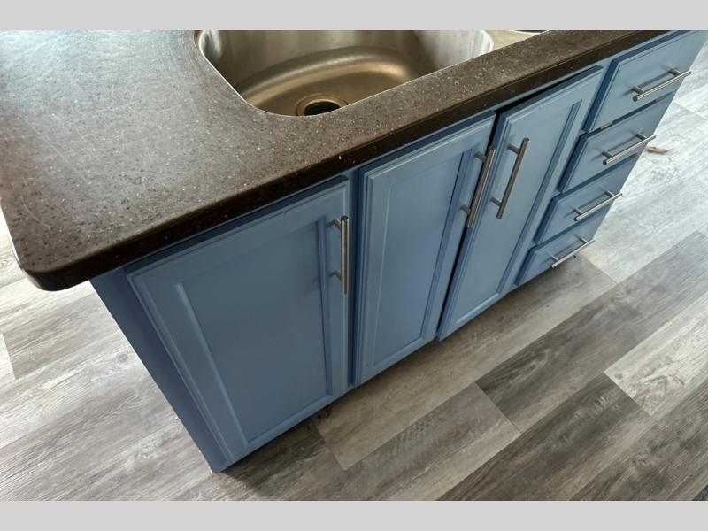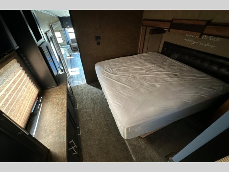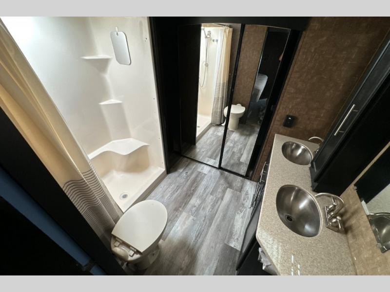 Inside the fifth wheel you will love how open and spacious this model feels. In the kitchen/living area there are slides on either side. The first slide has a free-standing table/chairs and optional theater seating. Along the rear wall you will find a deluxe sleeper sofa with end tables on either side of the sofa. The other slide has an entertainment center, plenty of counter space, a three burner range, refrigerator, pantry, pull out spice rack, and pull out trash bin. Adjacent to the slide there is a hutch with overhead cabinet. And don't forget about the kitchen island which has a double kitchen sink, surrounded by counter space which makes food prep a breeze.