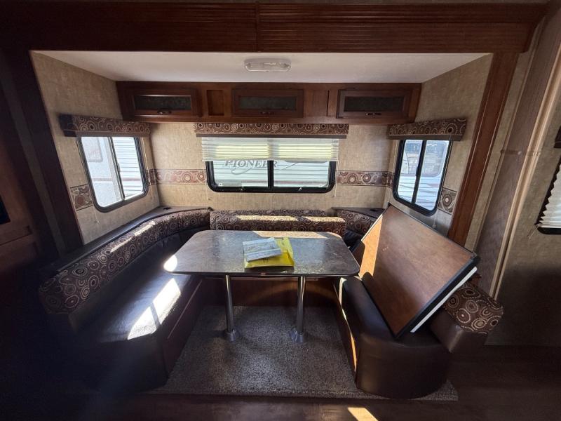 The living area has a u-dinette slide with an entertainment center next to the slide. The opposite side of the travel trailer offers a pantry, refrigerator, three burner range, and double kitchen sink.
