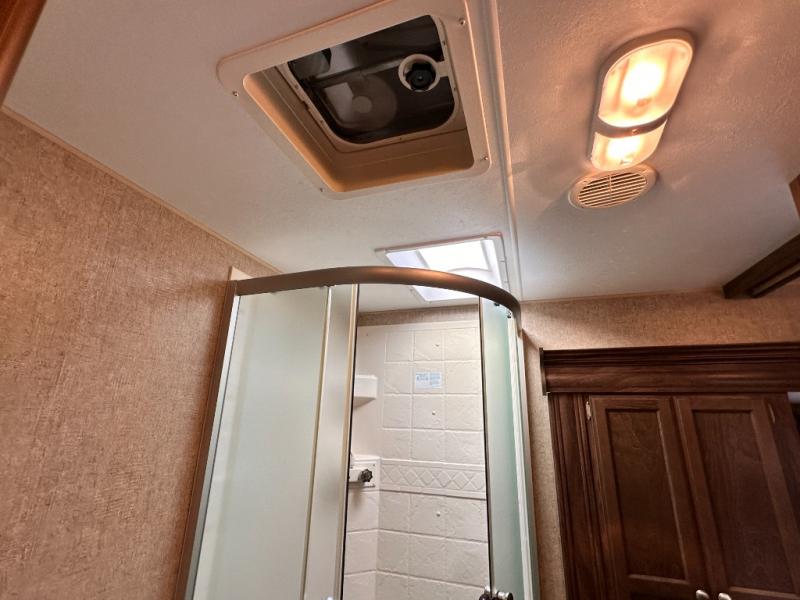 The large exterior pass thru storage area comes in handy for packing and unpacking the outdoor gear. The 14' awning provides much needed shade on those sunny camping trips. There are many more features to enjoy in this fifth wheel!
