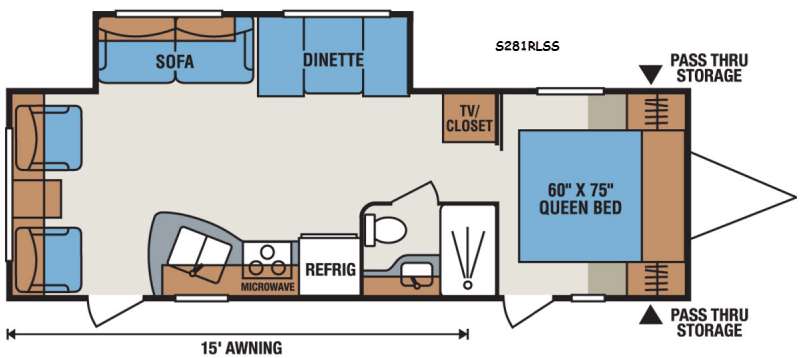 As you enter the rear entrance, there are two lounge chairs along the rear wall. The slide has a sofa and dinette. Next to the dinette you will find a TV outlet/closet. The opposite side of the travel trailer has a double kitchen sink, three burner range, microwave, overhead cabinet, and refrigerator.