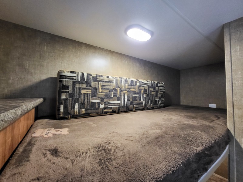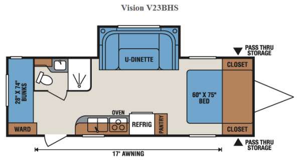 The Vision V23BHS travel trailer by KZ offers a single slide and a rear set of bunk beds.