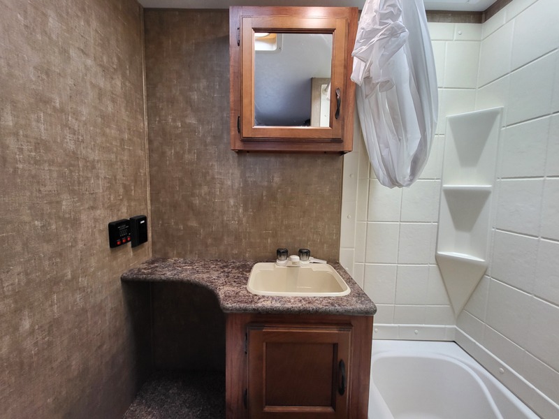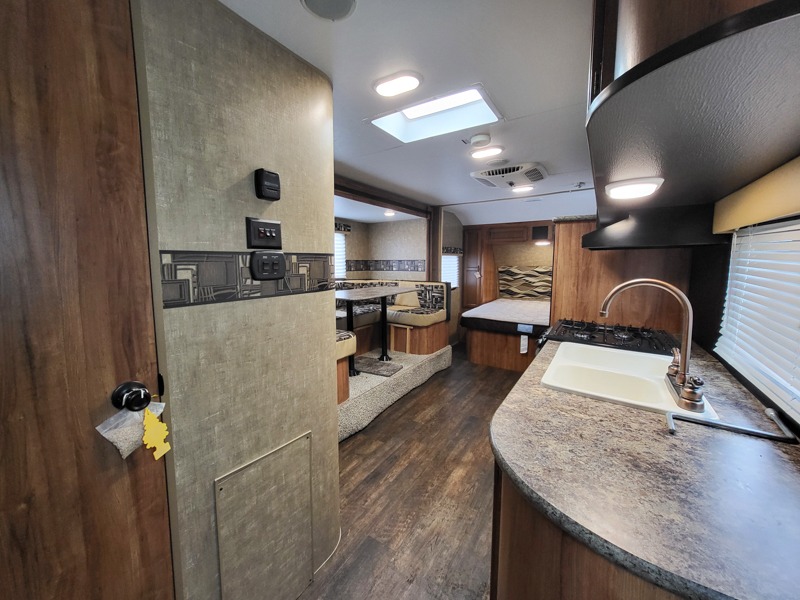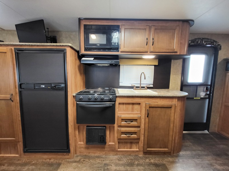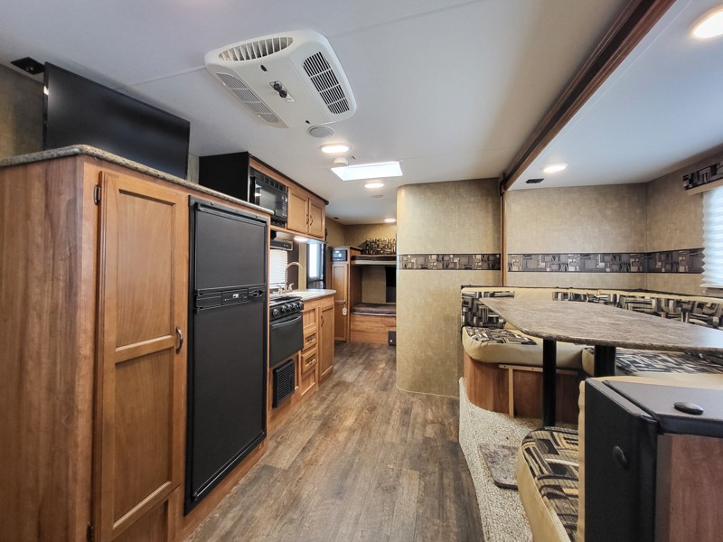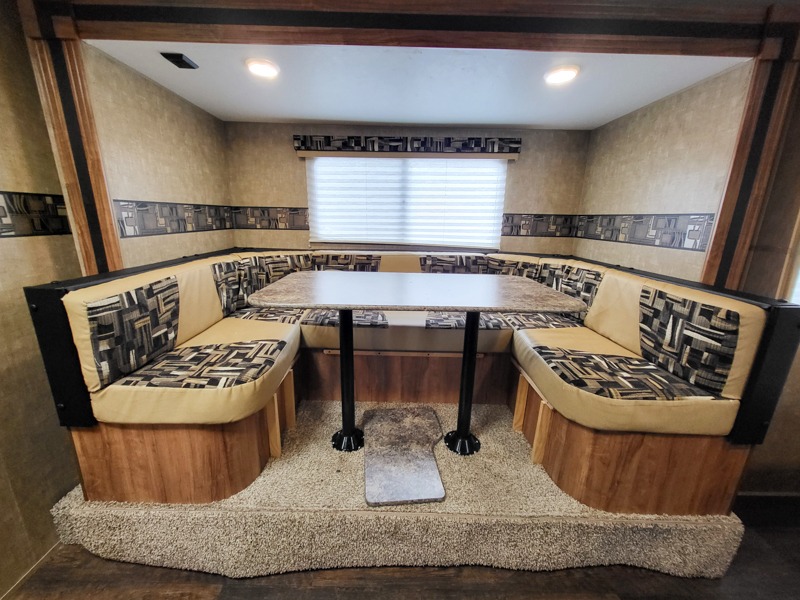 In the kitchen area there is a u-dinette slide on one side of the trailer. The opposite side offers a double kitchen sink, three burner range, oven, refrigerator, and pantry.