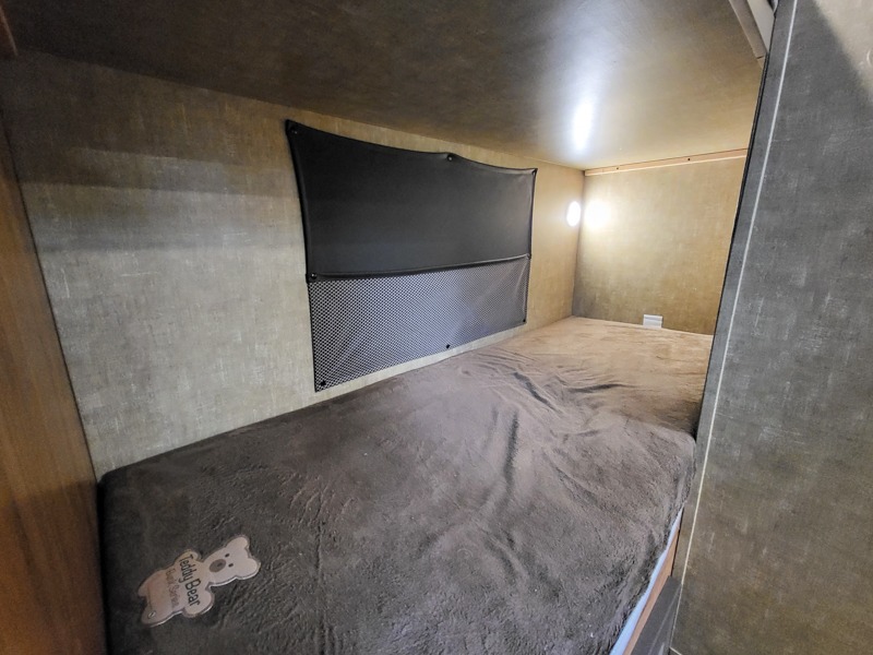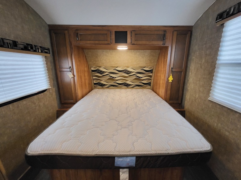 In the front of the trailer there is a queen bed with closets on either side of the bed.