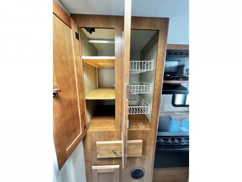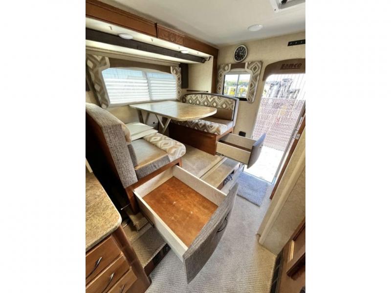Step inside and see the extra floor space that having a slide out provides. The dinette slide easily gives you more interior walking around space and comfortably seats everyone during mealtimes, and also provides additional sleeping at night if needed. There are also two storage drawers in the dinette seats to neatly tuck things away.