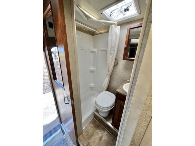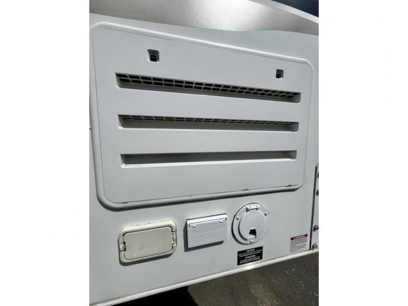 The front bed area is a step up from the rest of the camper and features a queen size bed with pillow-top innerspring mattress. Enjoy storage in the rear right corner and front left. There is also a hamper for your dirty clothes along the right side. In the rear left corner find a entertainment center where you can choose to add the optional 24" 12 volt LED TV for enjoyment when inside hanging out.