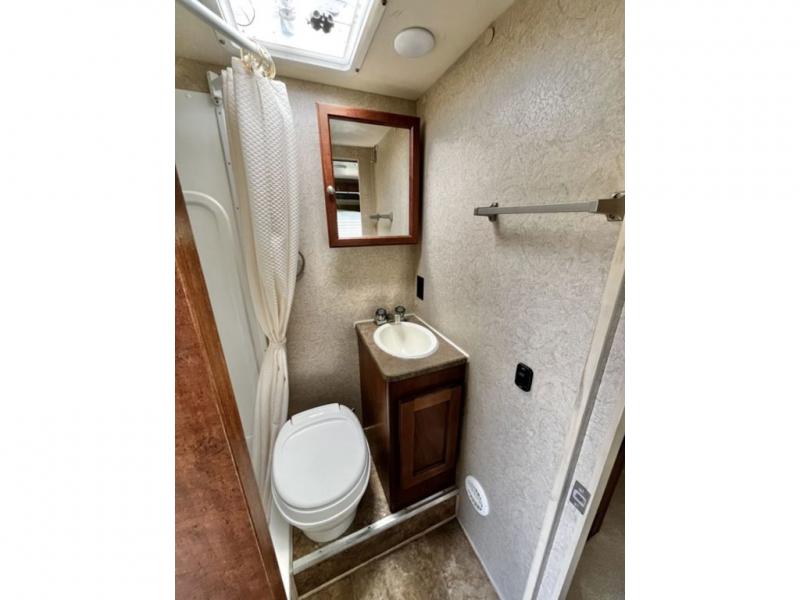 The rear corner bath just to the left of the entry door features a toilet, sink and tub/shower with skylight and fan. There is also a medicine cabinet above the sink which features storage and a mirror.