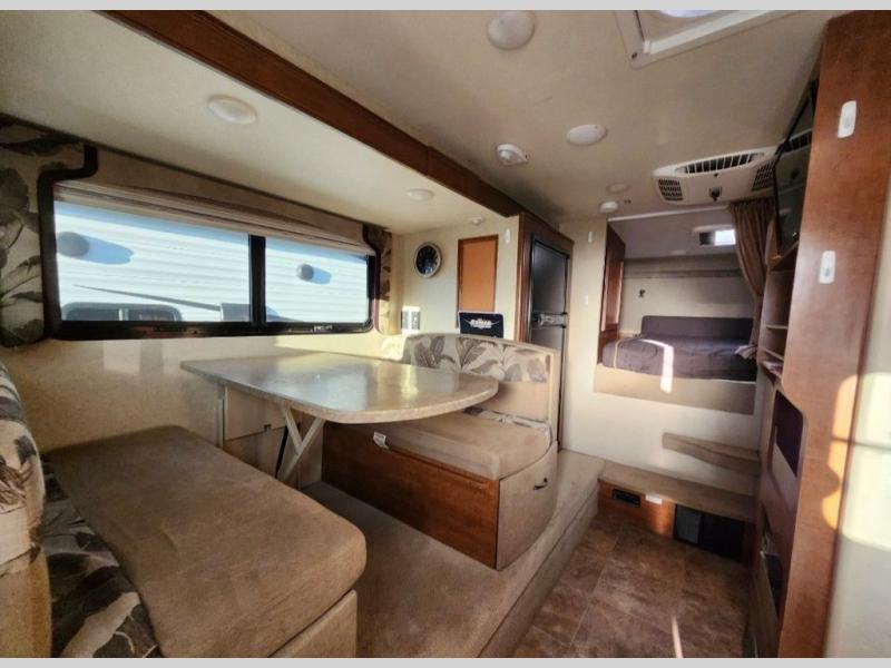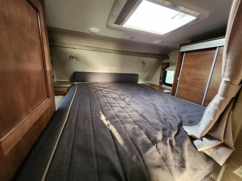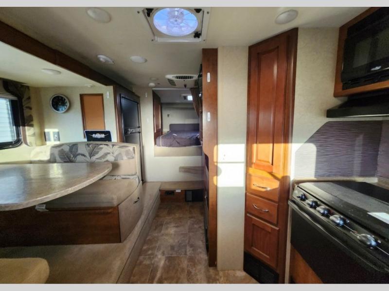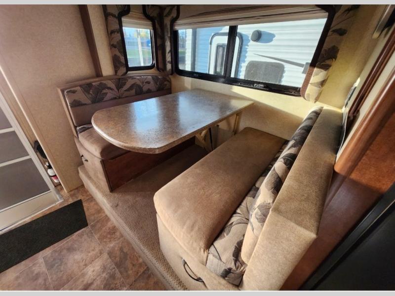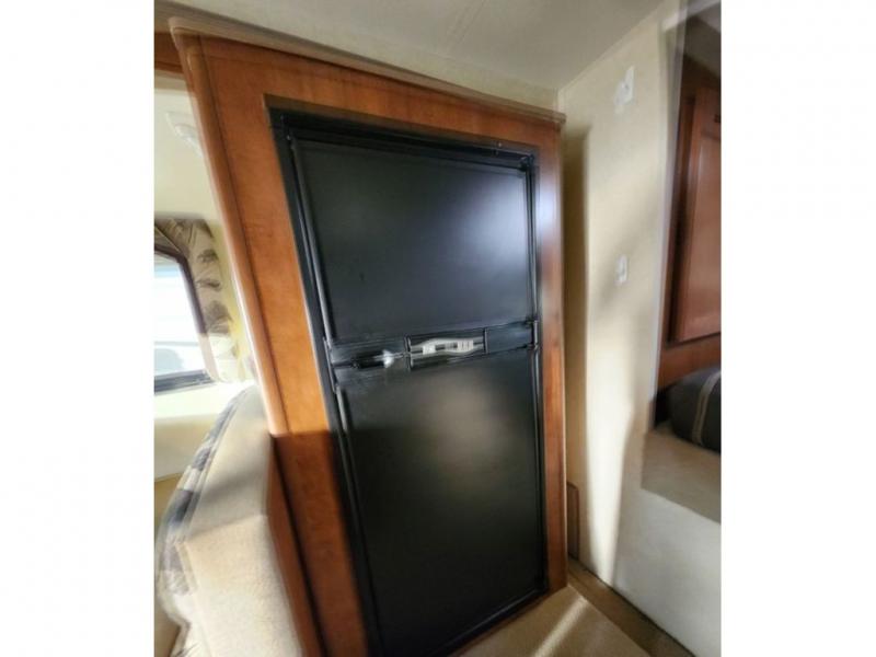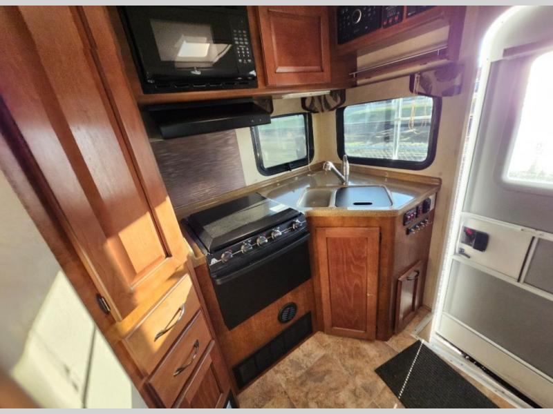 Step inside and notice the storage cabinet to your left. The dinette and refrigerator slide opposite help to open up the floor space in this truck camper.
